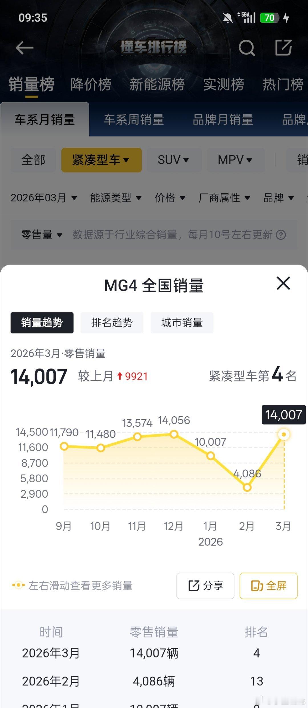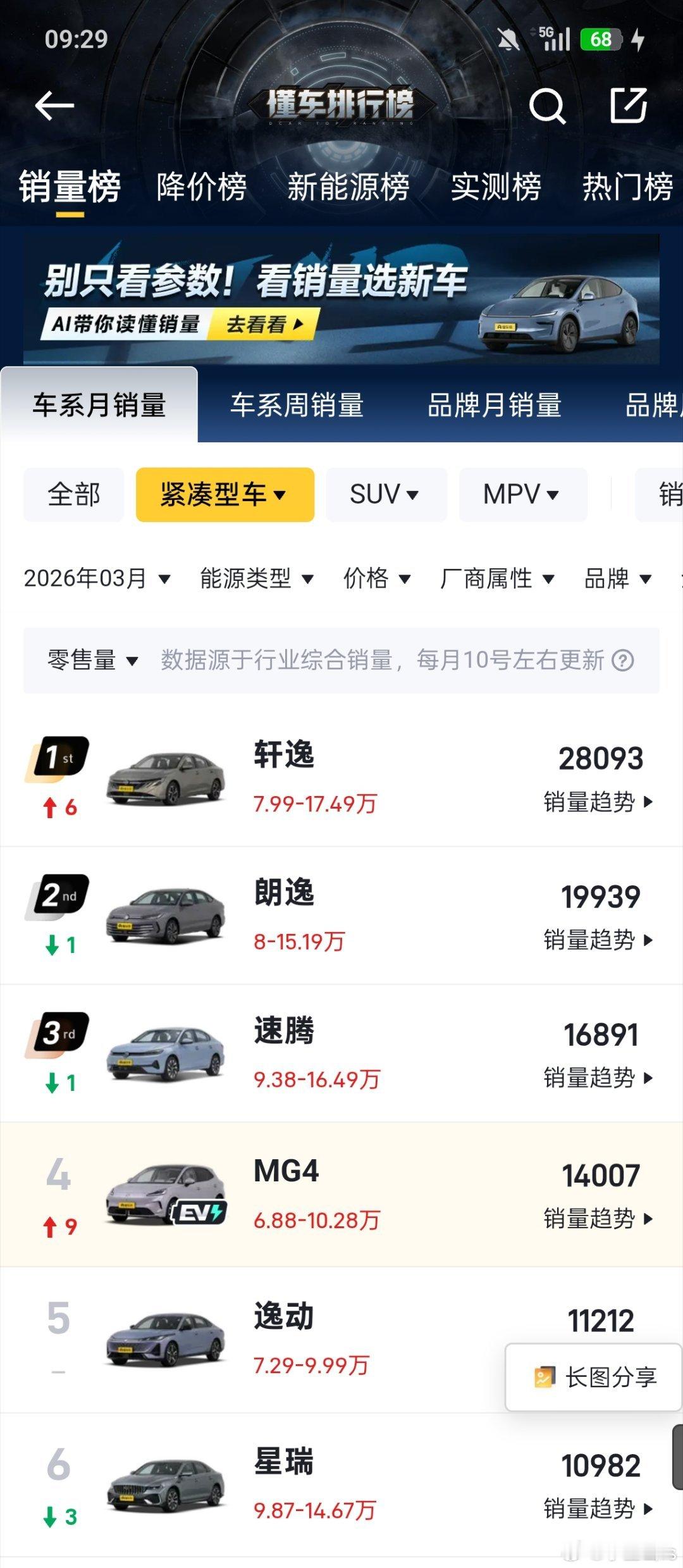 现在紧凑级电车里,卖得最好的原来是MG4,A级车销量榜冲到前4了!挺好的,6.8