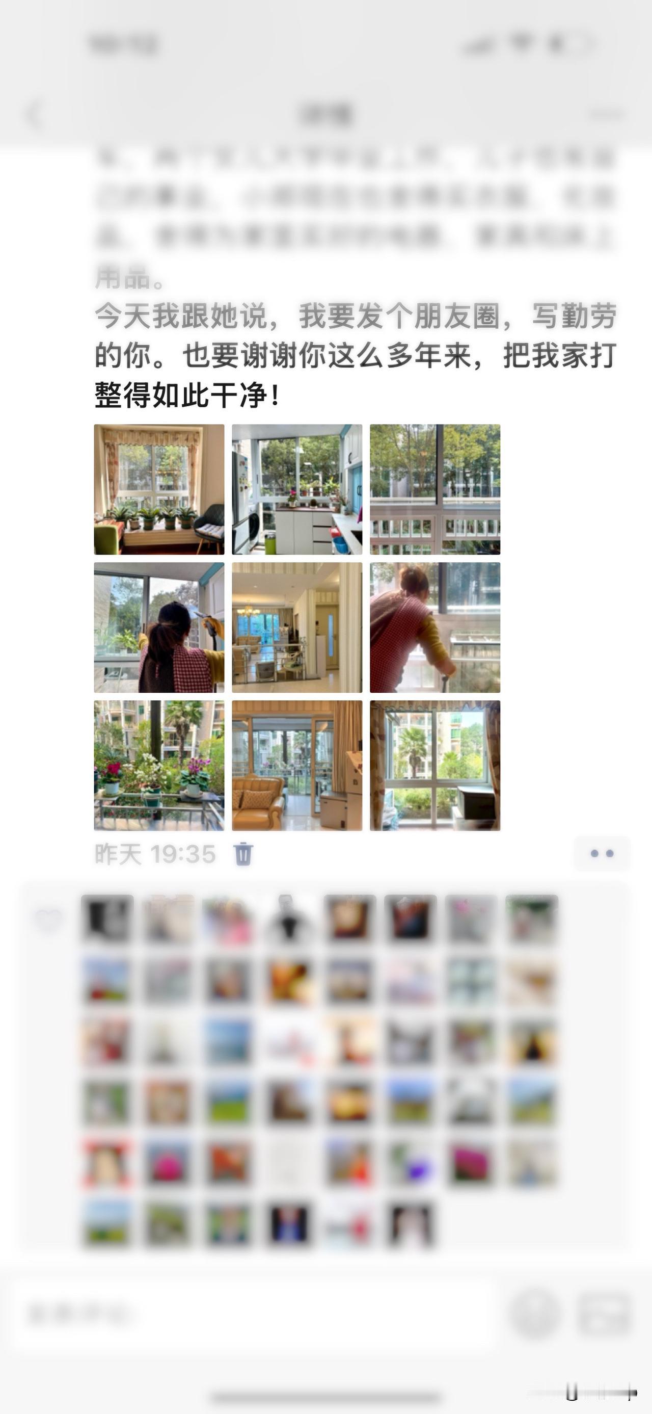 今天我对她说,我要发个朋友圈,写“勤劳的你”。同时,也要感谢她这么多年来,把我家收拾得这般干净!