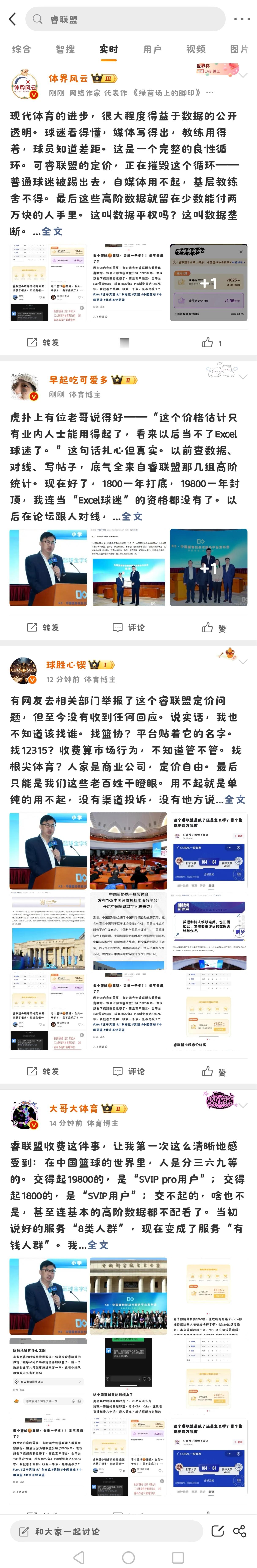 然后我看到虎扑上有人发帖,在微博上有更多人在说睿联盟收费这个事情,一搜一大片,除了数个月以前的有个别人说睿联盟数据好用(当然毕竟K8平台数据确实全),绝大多数都是最近,大家在说这个会员收费的事情,你随便一扒拉就能看到各种对一万八这个会员费的反对声。