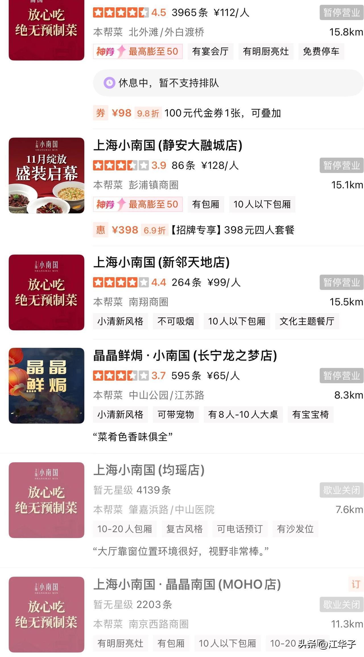 想不到上海著名餐饮连锁店小南国也全部关门歇业。