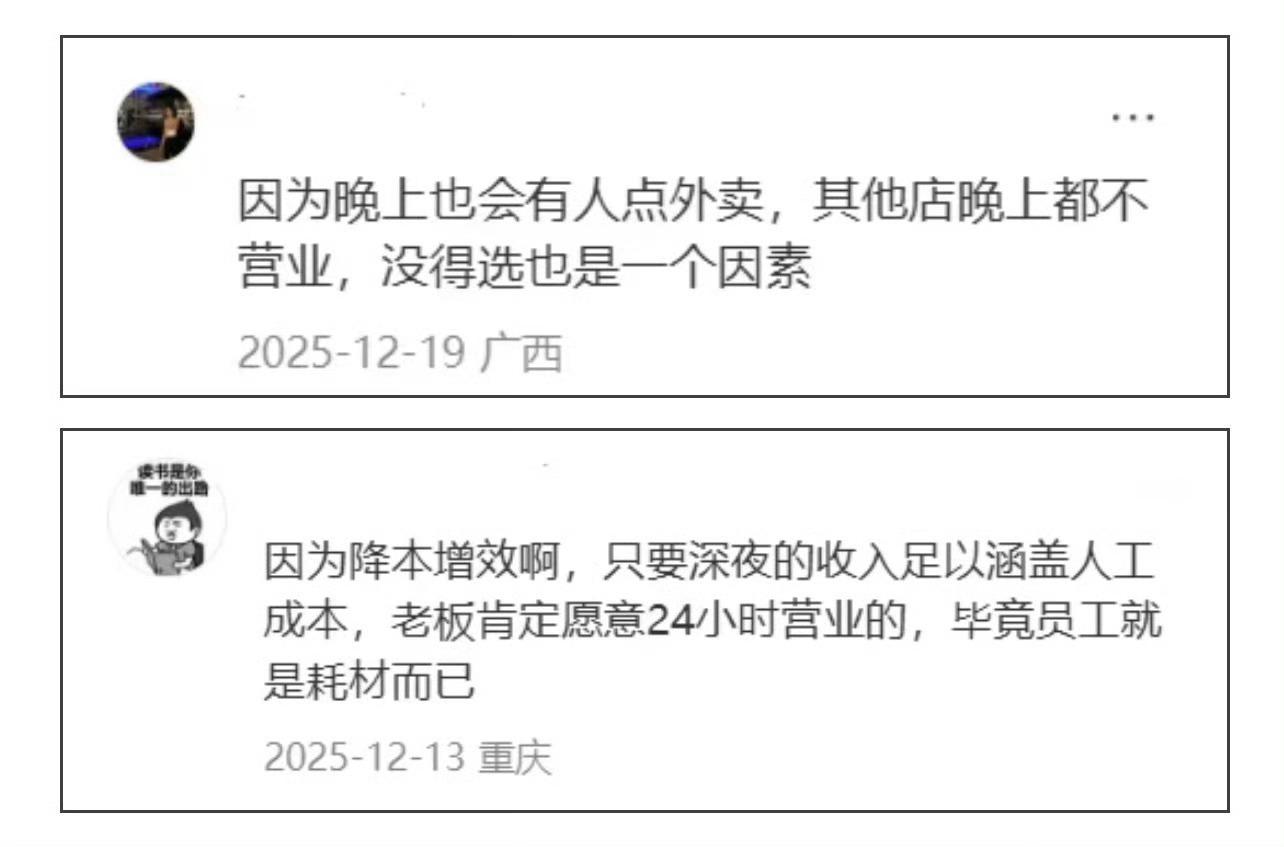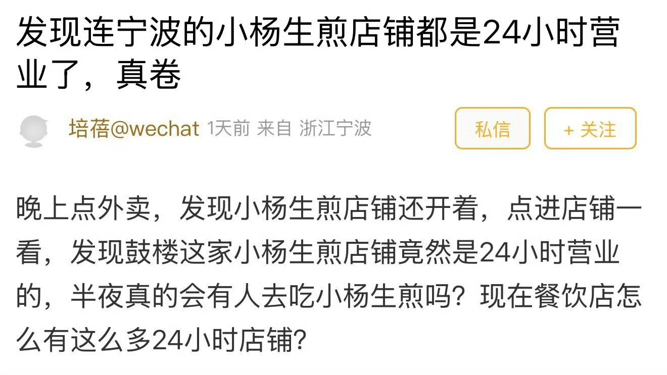 宁波这个知名连锁餐厅,都开始24小时无休营业了!网友:半夜有人吃吗?前有奶茶店24小时营业,最近发现,宁波的小杨生煎都24小时营业了?一家吃正餐的店,7x24小时营业确实不常见。网友疑惑半夜有人吃吗?类似的餐饮店之所以会24小时营业,其实就是为了在晚上选择比较少的时候能占据更多市场。只要夜间营业额能覆盖人工成本,也就够了。