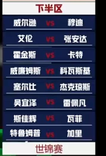 下半区,则是好手云集,世界第一第二特鲁姆普冏哥K威尔逊在列,还有塞大师,马克.威廉姆斯,吴宜泽,马克.艾伦。个个龟难缠,身经百战,技术出众,最难预测谁能从下半区杀出重围,与当红辣子鸡赵公子一较高下。