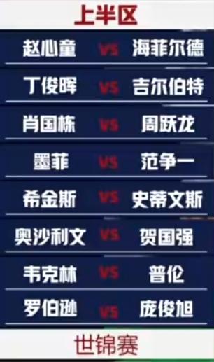 卫冕冠军赵心童抽得好签,处于上半区,上半区高手有火箭,墨菲,巫师,罗卜,他们都已经老迈年高,长局制比赛体能是关键因素。
