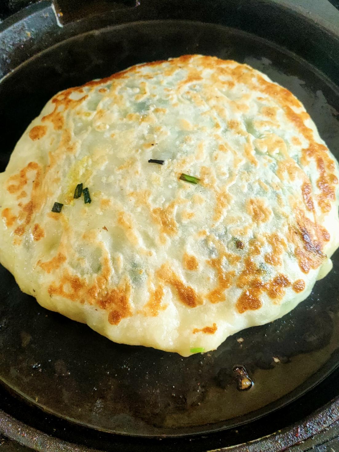 7,电饼铛提前预热,烙制一面定型,再翻面。烙至两面金黄即可出锅。