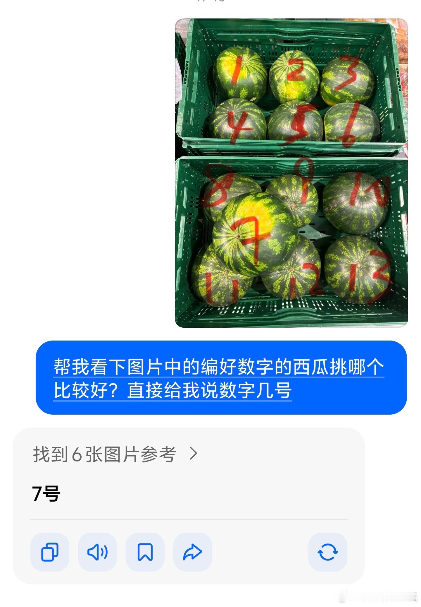 豆包帮挑的西瓜之前还真让豆包挑过西瓜,结果挑出来的又甜又红还没籽,妥妥的梦中情瓜