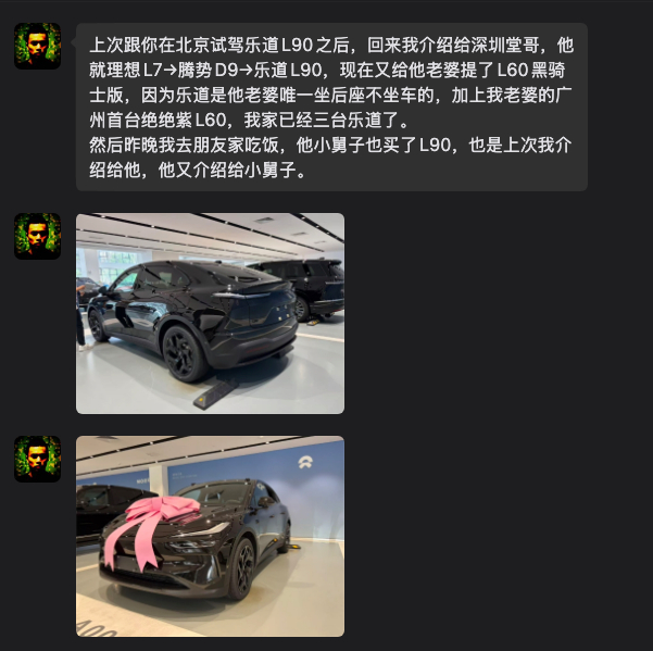 我的客座摄影师兼好兄弟,去年陪我去喜鹊梁拍了乐道L90之后,自己买了乐道L60给他老婆,他推荐他堂哥买了从理想L7和腾势D9换成了乐道L90,现在堂嫂买了L60黑骑士版,因为乐道是她唯一坐后座不晕车的车。加上他自己的广州首台绝绝紫L60,全家已经三台乐道了。最近他又推荐朋友买了另一台L90,看来他很适合做乐道销售,沈博你觉得呢?