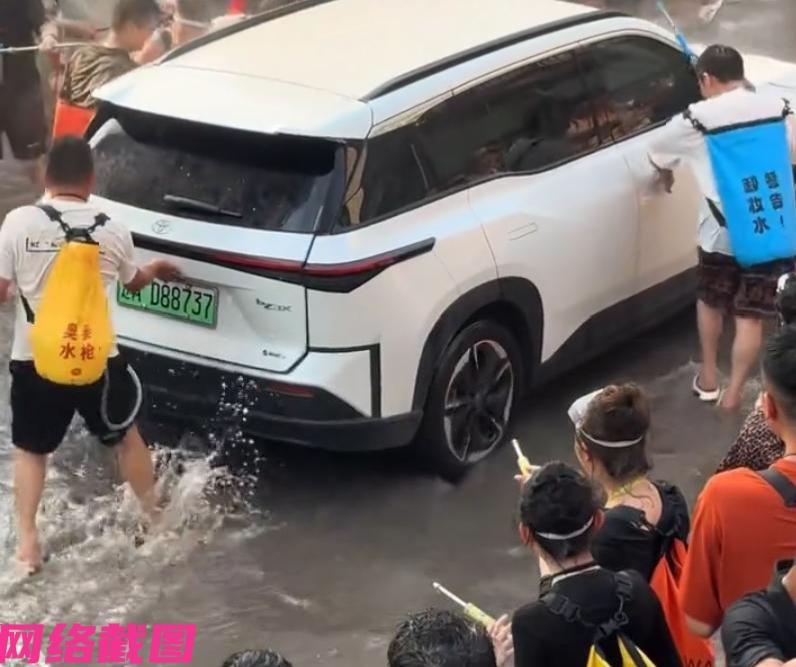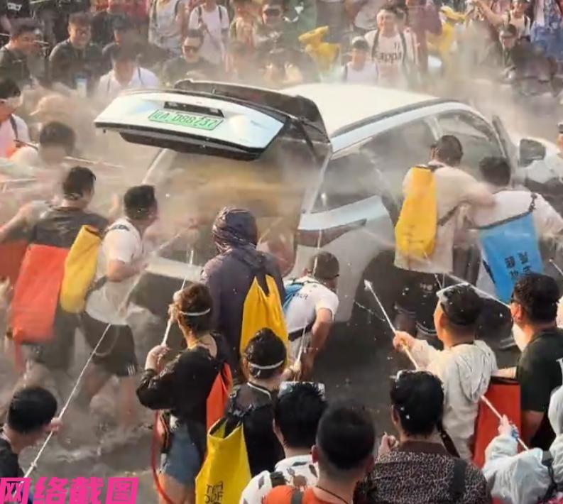 云南泼水节上见得一辆辽A的白色新能源车路过,可是众人在现场,不光朝车上浇泼水,还把这辆车的车门与车后备箱打开,随后有多位男子直接对其车泼水嬉闹。