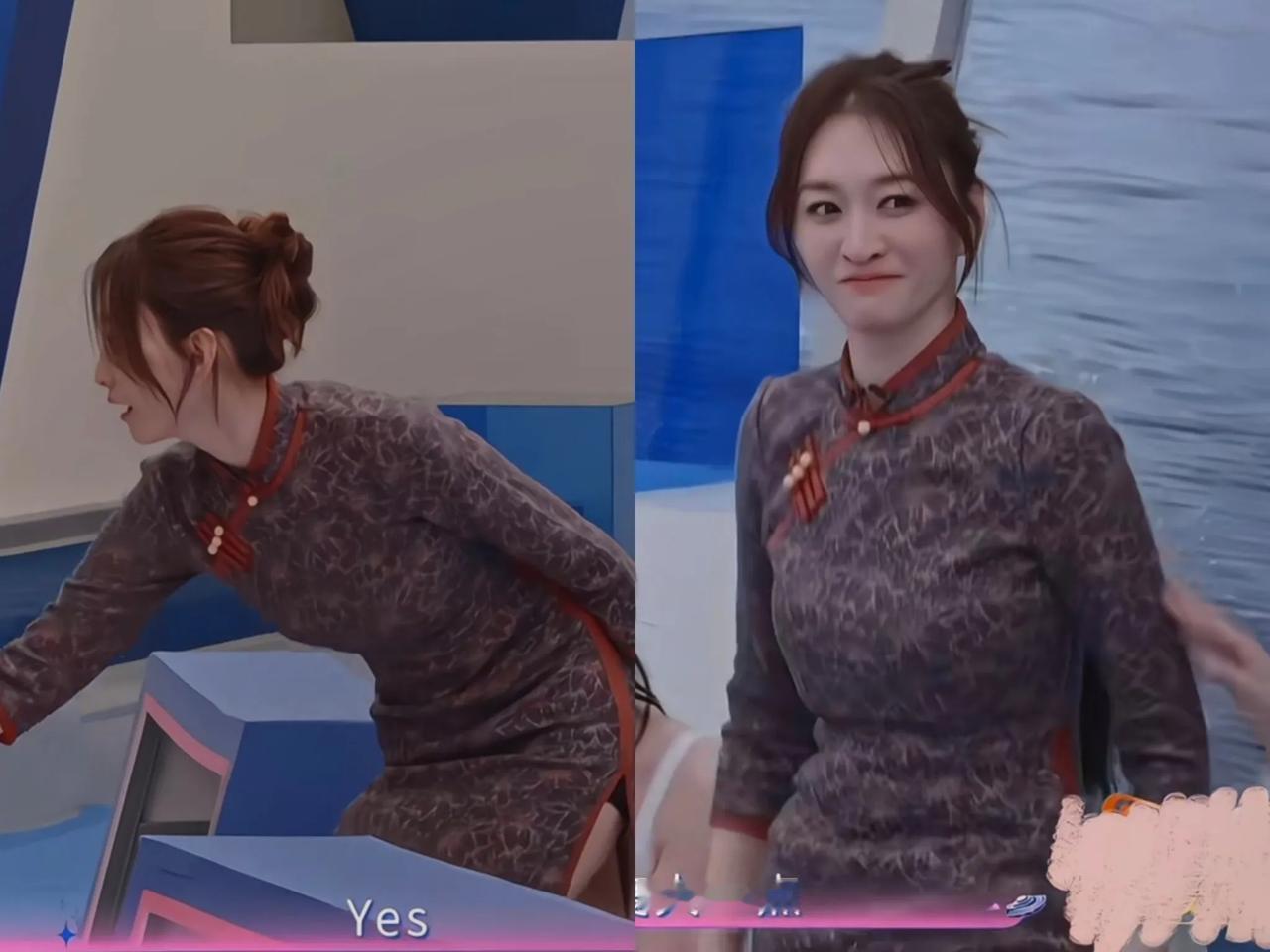 她在浪姐综艺,穿着一身比较暗色的旗袍,这个颜色一般人真的难驾驭,太显成熟了。