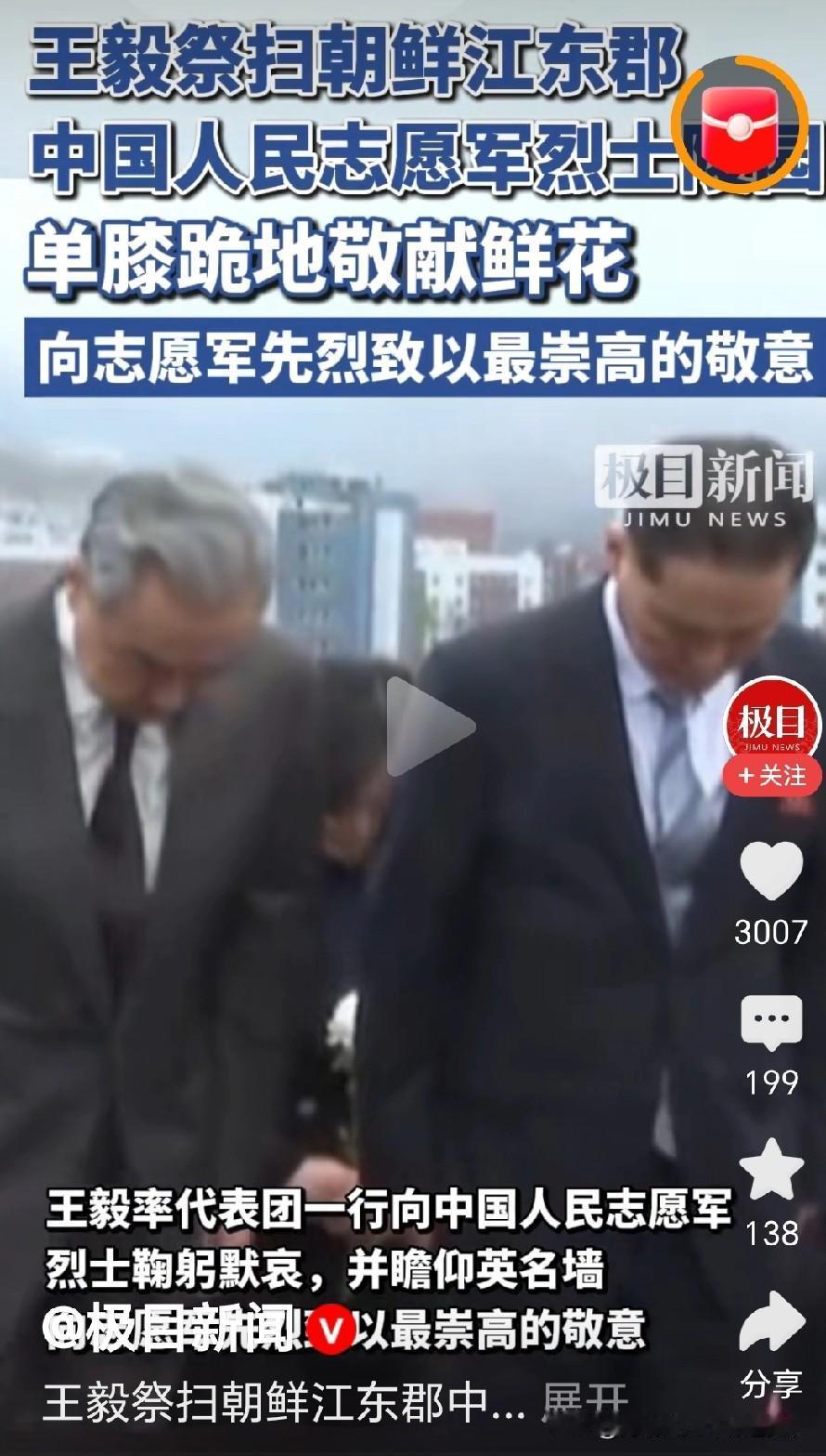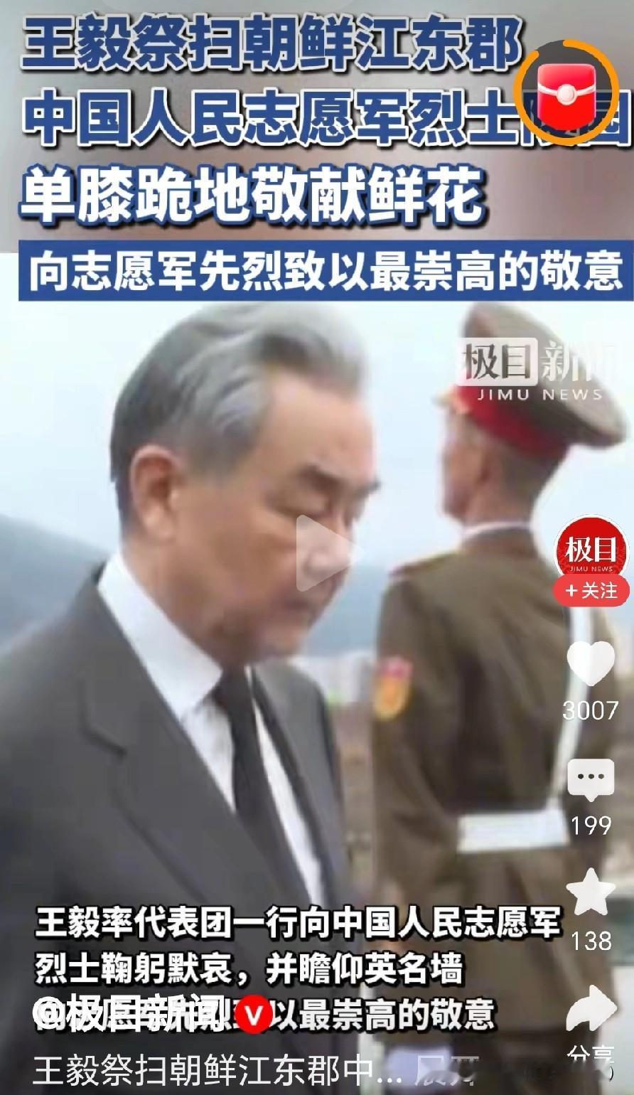 泪目了!王毅部长单膝跪地向中国人民志愿军烈士敬献鲜花。