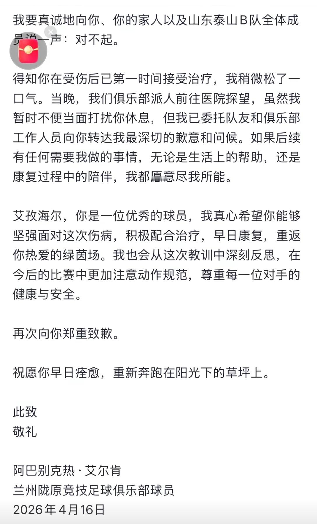 球员阿巴别克热·艾尔肯向重伤的泰山B队球员艾孜海尔·塔西麦麦提本人及其家人、山东泰山B队全体成员发致歉信!