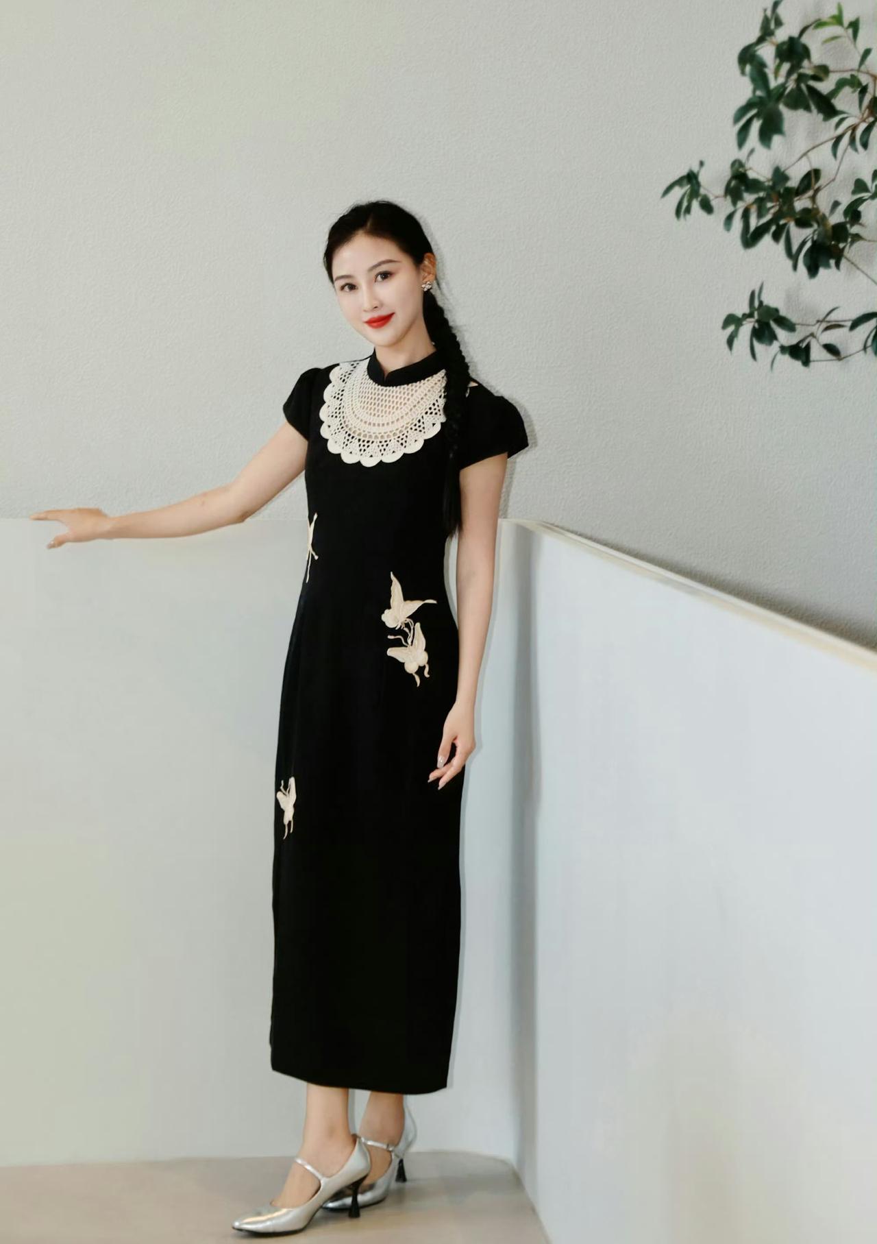 一袭墨色旗袍,绣蝶衔香,勾勒东方温婉风骨。