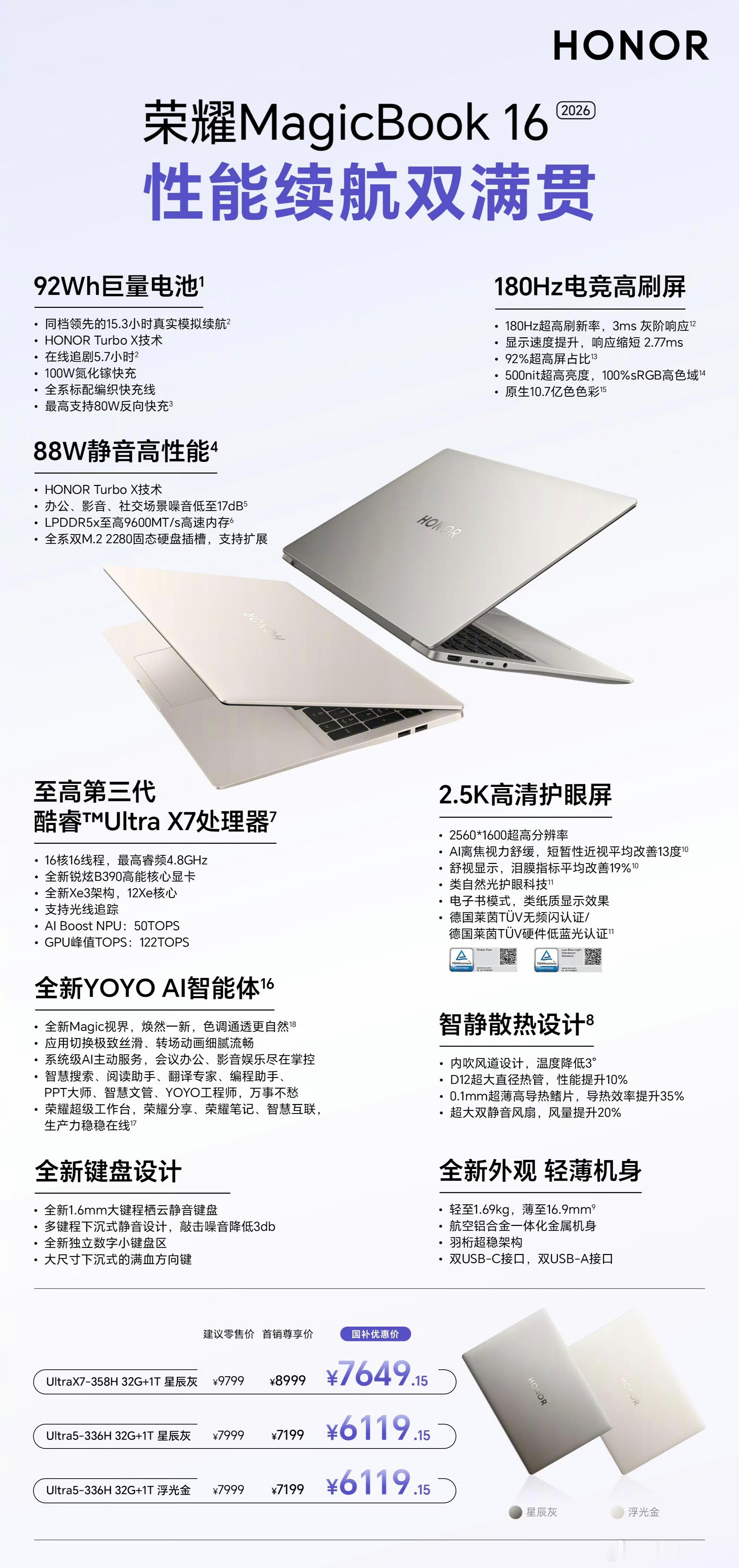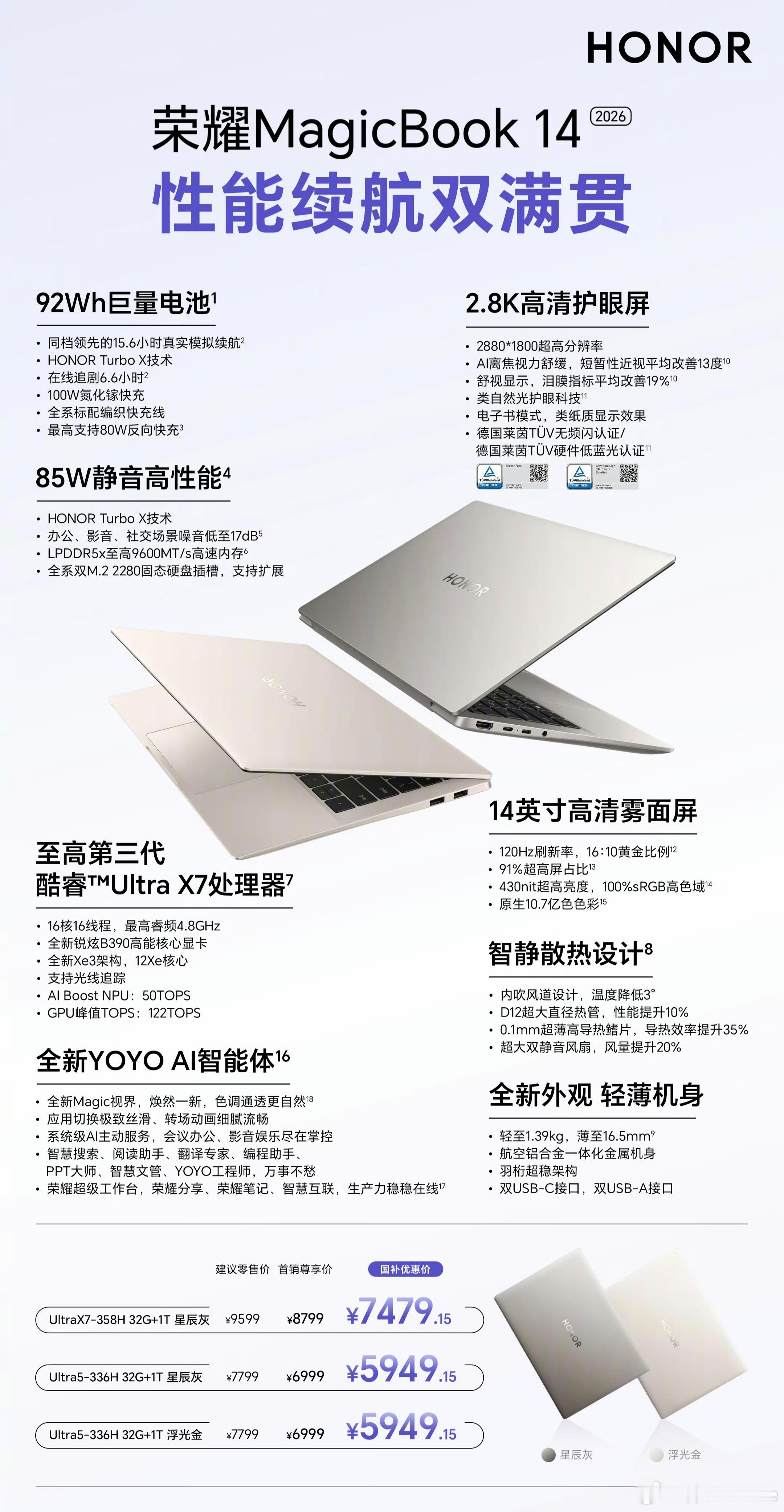 荣耀MagicBook 14 2026,顶配Ultra X7 358H 32G+1T,9599元,首销8799。荣耀MagicBook 16 2026,顶配Ultra X7 358H 32G+1T,9799元,首销8999。没开售Ultra 5 338H的版本。