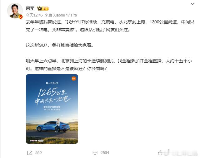 雷军将全程直播15小时 这次新SU7,雷军为了展示续航,跟YU7当时一样又要来一