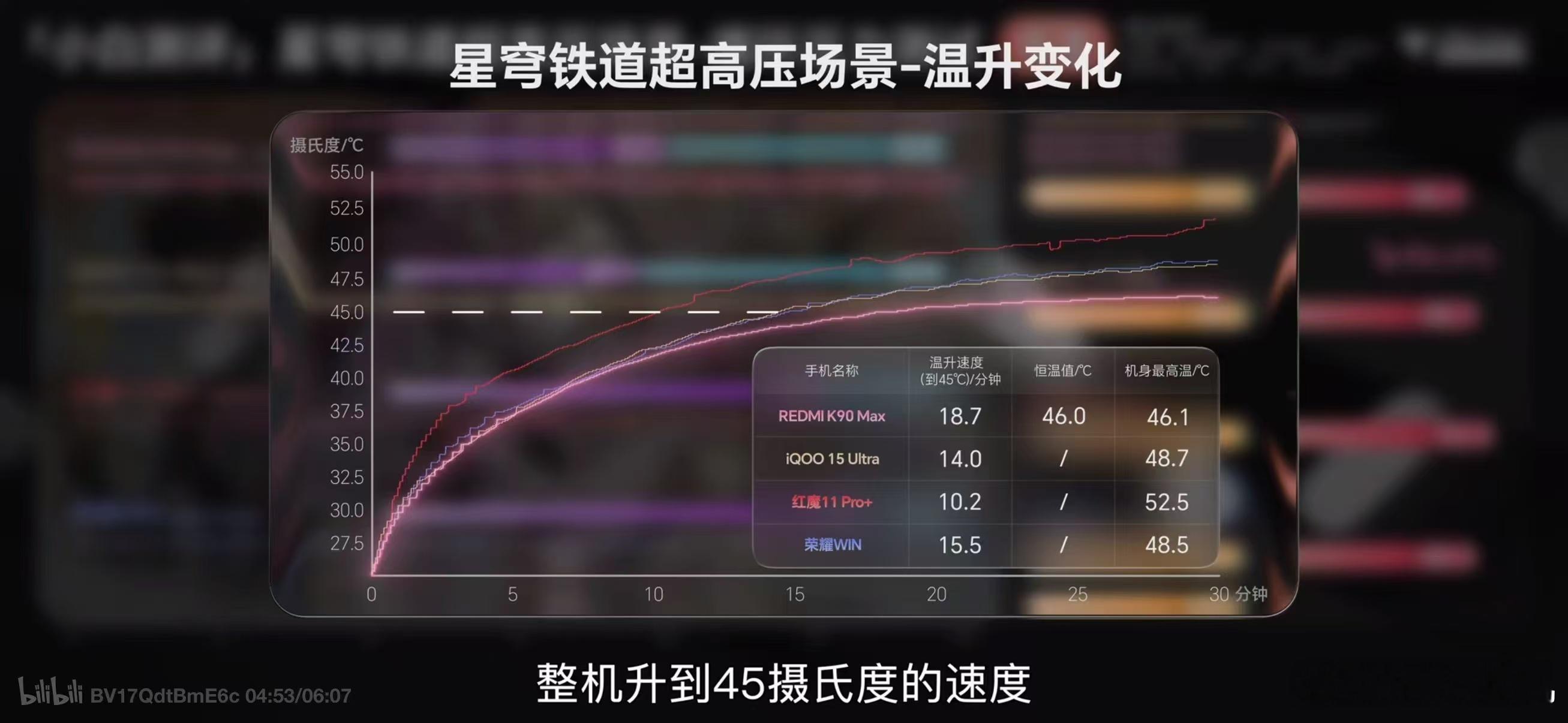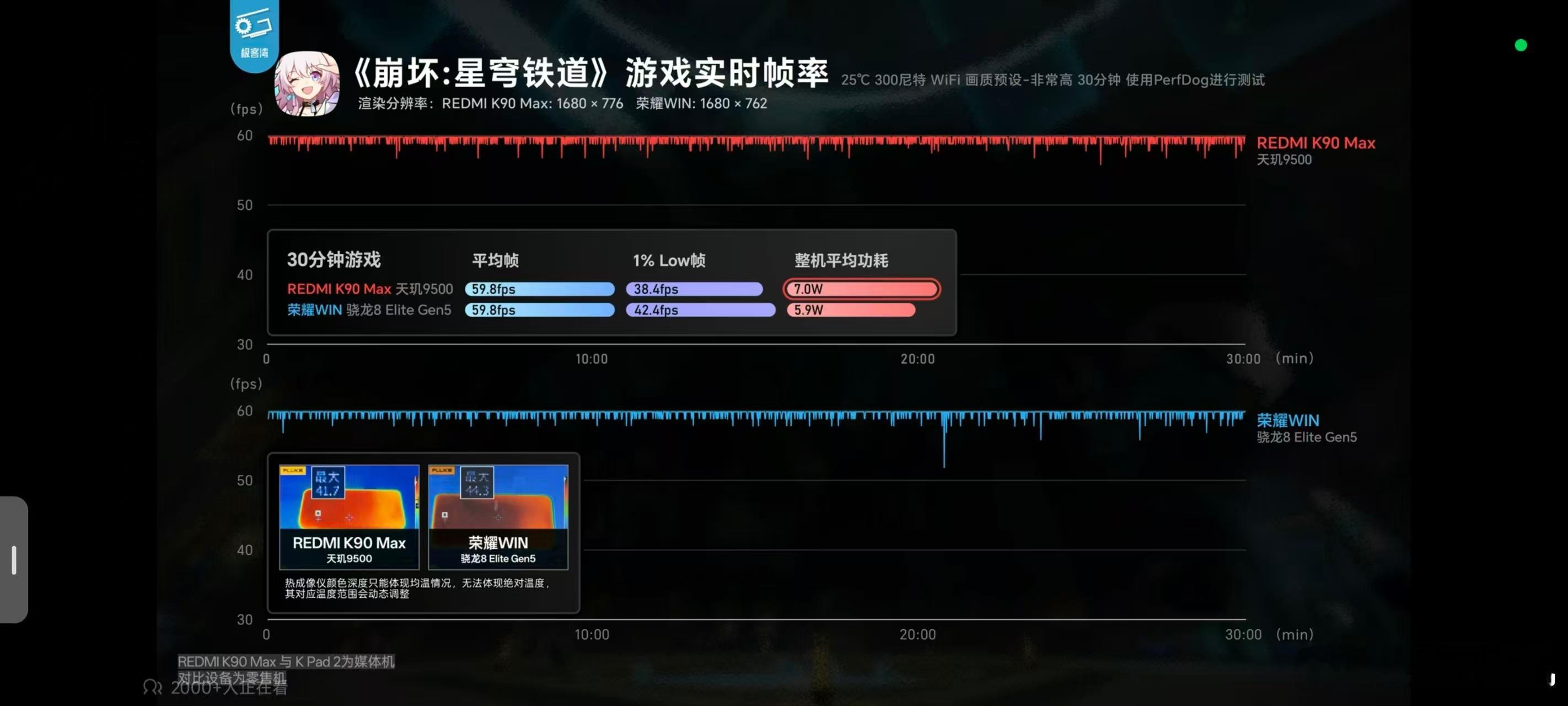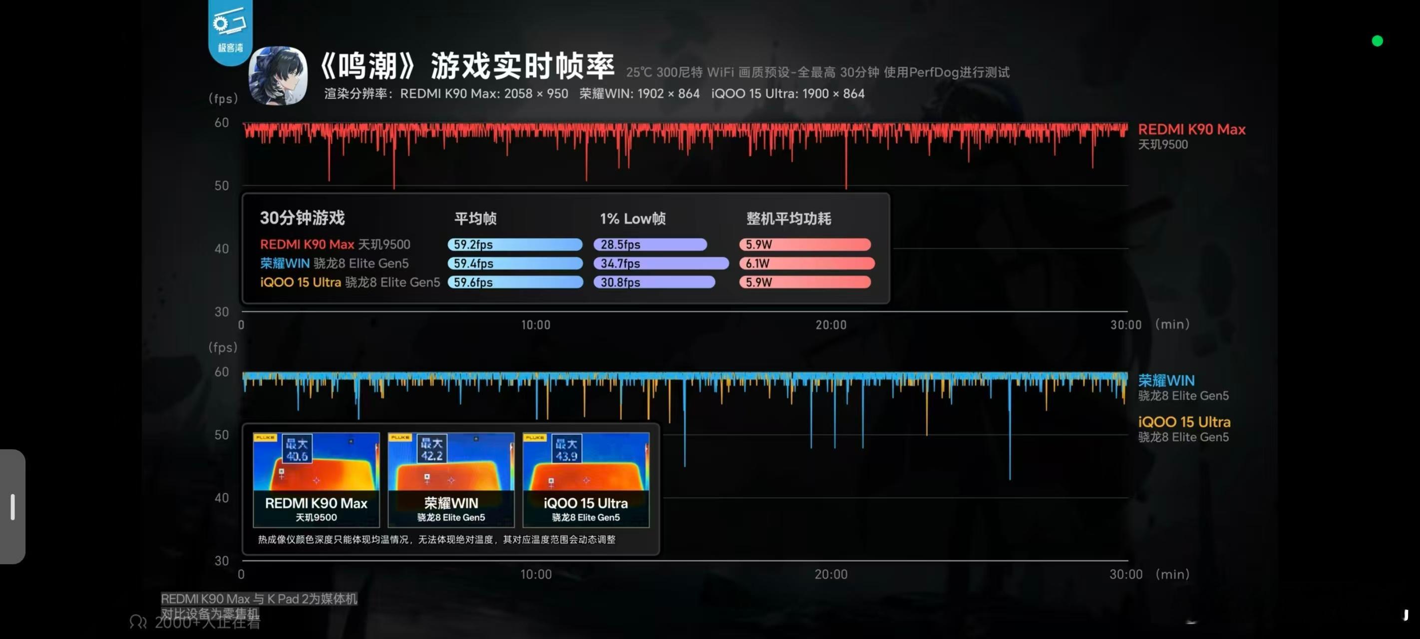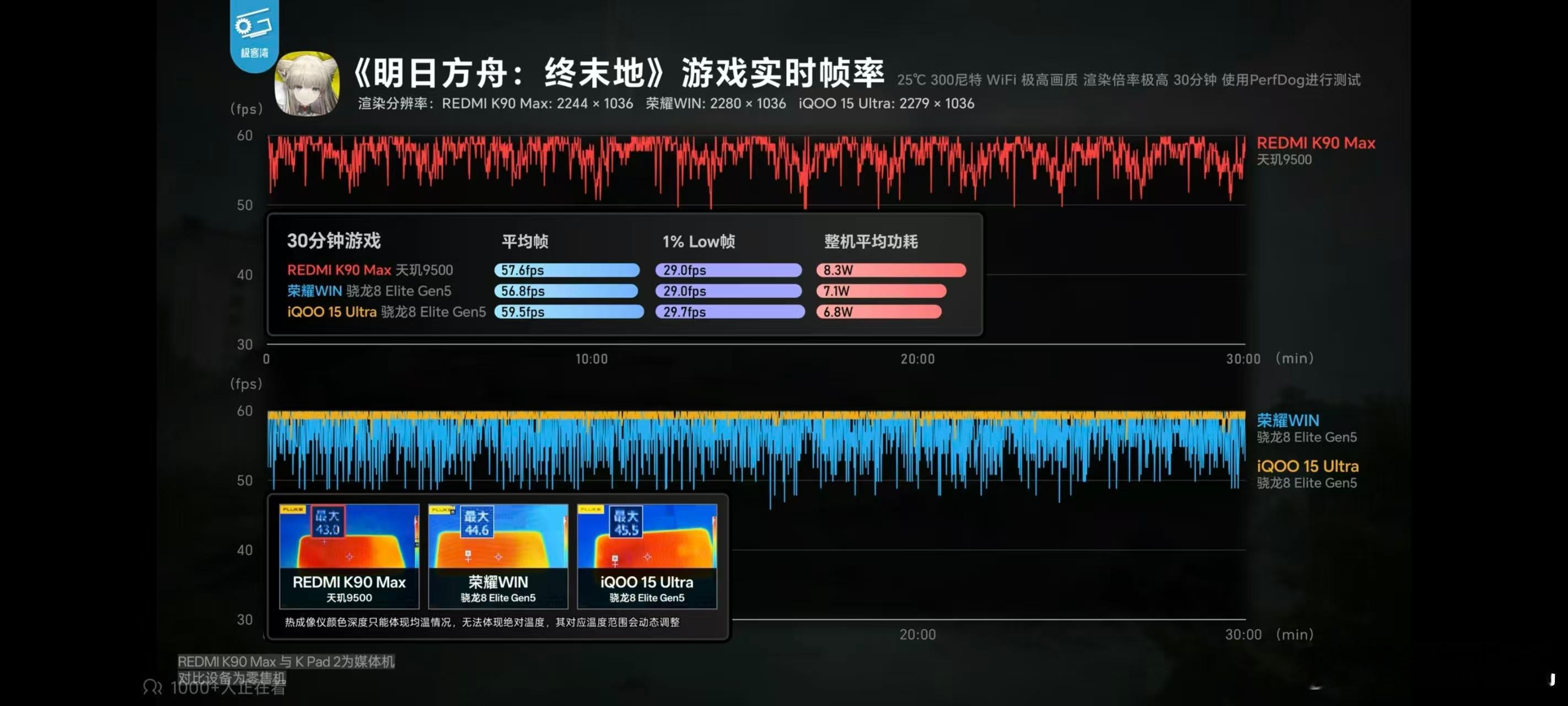 在各家的评测当中表现都非常不错,像极客湾的测试当中,998P的崩铁测试半小时满帧运行,直接温度都给压下来了。950P画质下满帧鸣潮,温度也压到了43.7度,和iQOO 15 Ultra一个水平。iQOO 15 Ultra可是第五代骁龙8至尊的手机。在明日方舟的测试当中甚至超过了很多第五代骁龙8至尊机型的表现。这次K90 Max证明了风扇+天玑9500的组合应该是游戏手机的最优解。