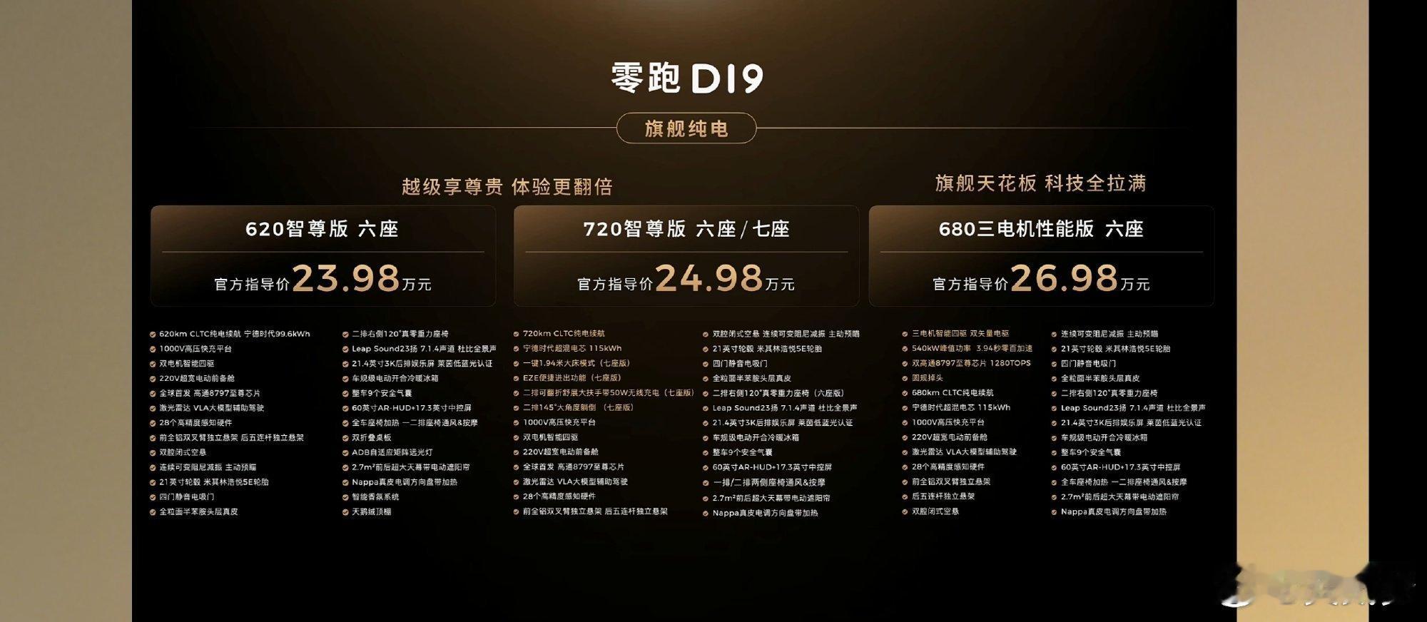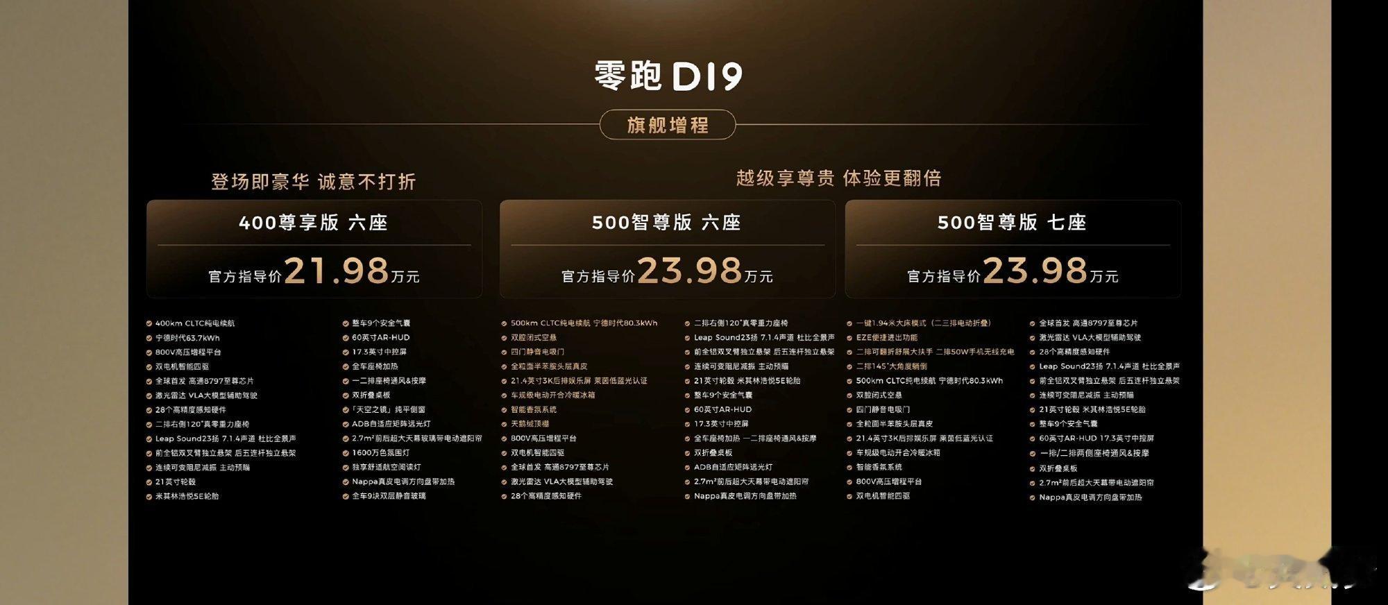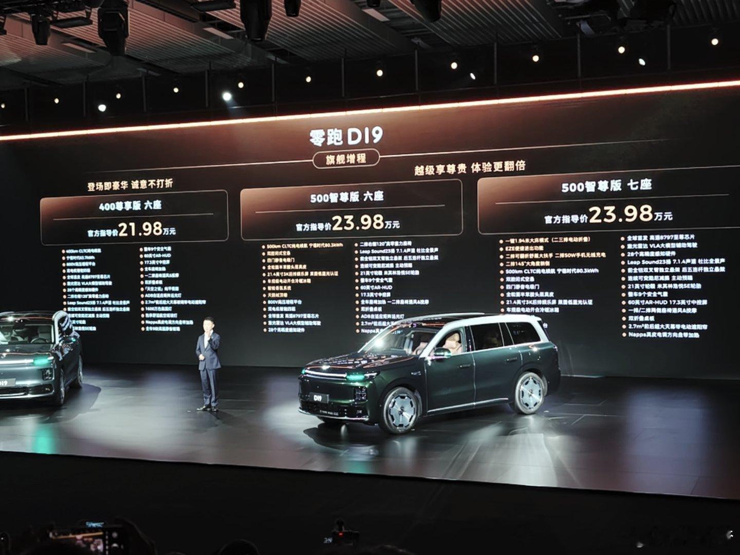 零跑D19真的才20出头的价格呀大家可以看看这个配置,很夸张你要看21.98万元增程起步这个配置,63.7度的宁德时代的电池,芯片和电机都拉满的我后悔没下个小定了,你说我们选个增程高配吧,也才23.98万而已原来9系旗舰SUV价格也能这么香零跑发布会零跑D19满配豪华上市21.98万起