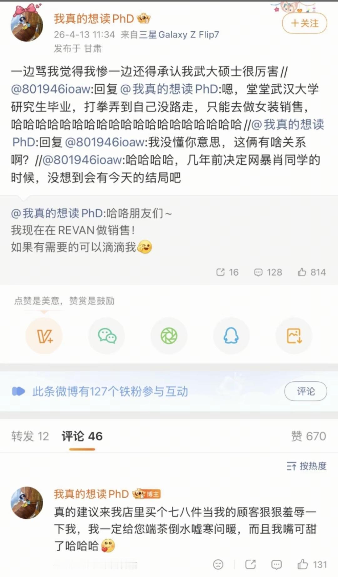 武汉大学图书馆事件女主当了某品牌女装销售员目前已经被开除!该品牌表示自己比较倒霉! 想不通这样的人物还能在网上吃互联网这碗饭,在互联网上发表着各种言论,这种不应该像其他网红一样进行封禁处理吗? 各位是怎么看的?欢迎评论区留言。