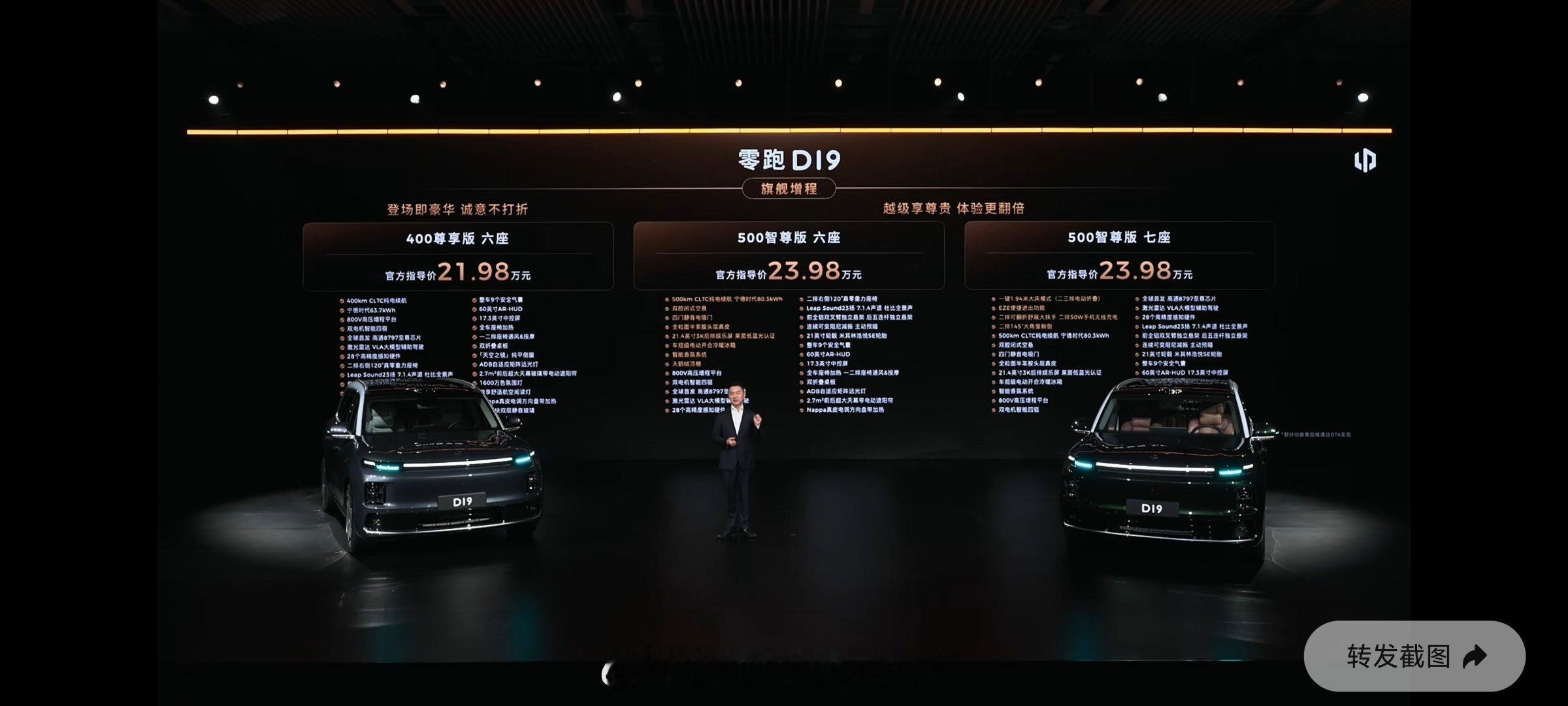 零跑d19今晚不出意外的话就是出乎大家的意外了~零跑最大最旗舰的SUV.居然只需要21.98-26.98万~还请了费老师这张不老男神的脸来现场,还给出这么这么没底线的实惠价这可是看着哪哪哪都很量大的六七座大型SUV啊~21.98万的增程入门款,纯电续航居然能做到400km~纯纯的家用水桶车,但凡指出一些不满意的地方,看在价格的份上,都能忍了大v聊车