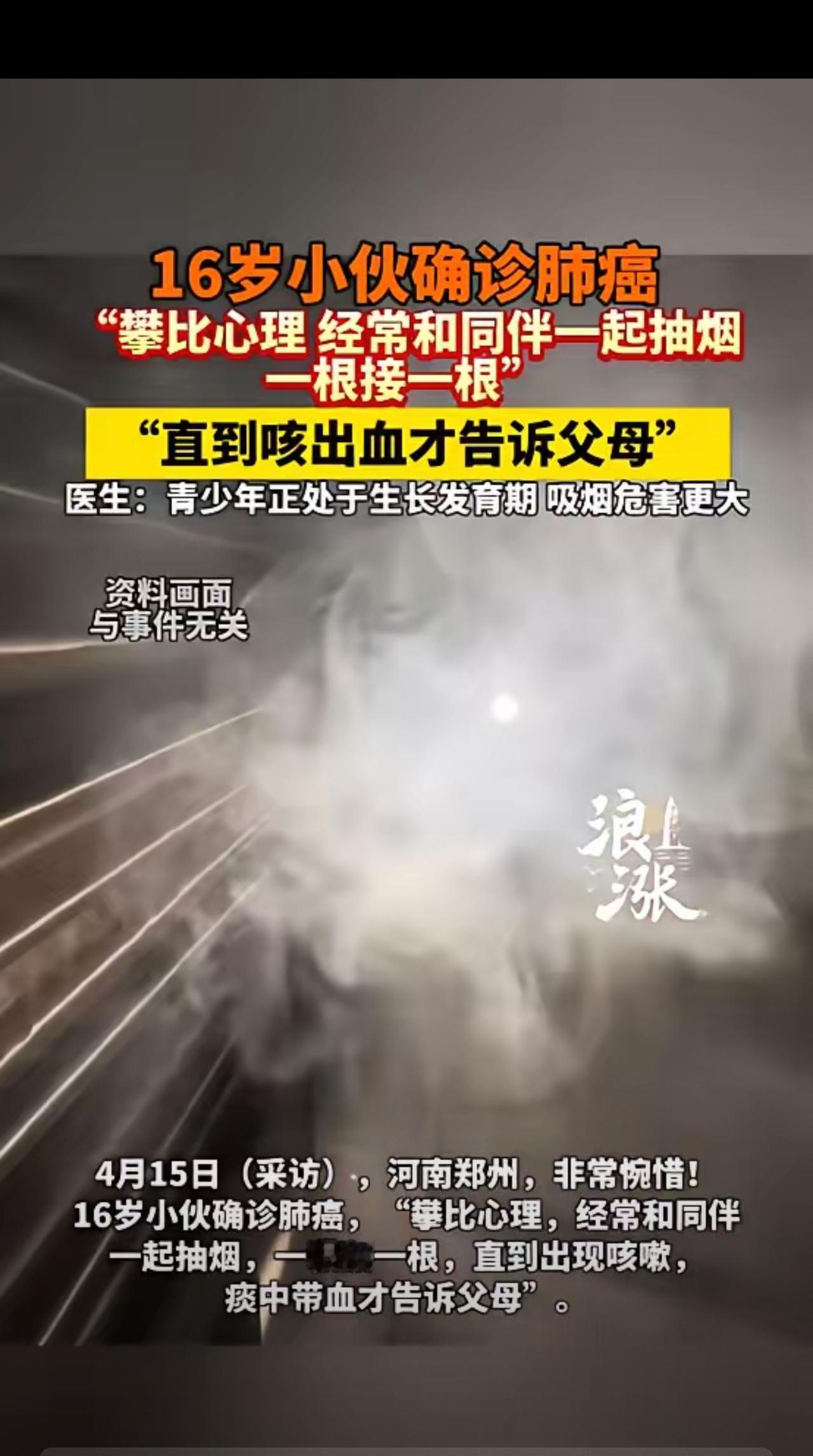 “悲剧还是发生了!”河南郑州,一16岁男生因为攀比心理,看见同伴抽烟,自己也跟着抽,并且一根接一根,出现咳嗽也不重视,直到咳出血才告诉父母,去医院检查后,发现男生竟确诊为肺癌,医生都表示十分惋惜!网友:太痛心了!