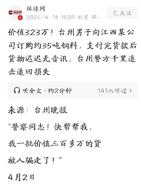 心太大了!浙江台州,男子花323万,向江西一家公司订购了35吨铜料,全额付款后,