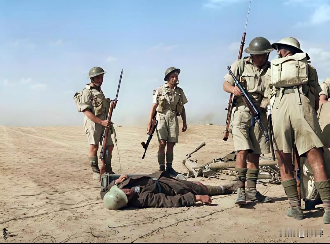 阿拉曼战场,北非沙漠的烈日下,英军士兵身着卡其制服,手持李-恩菲尔德步枪,围在倒地的德军士兵旁。这场二战北非战场的关键战役,英军以坚韧防线与精准战术,彻底粉碎了德军非洲军团的推进,扭转了北非战局的走向。