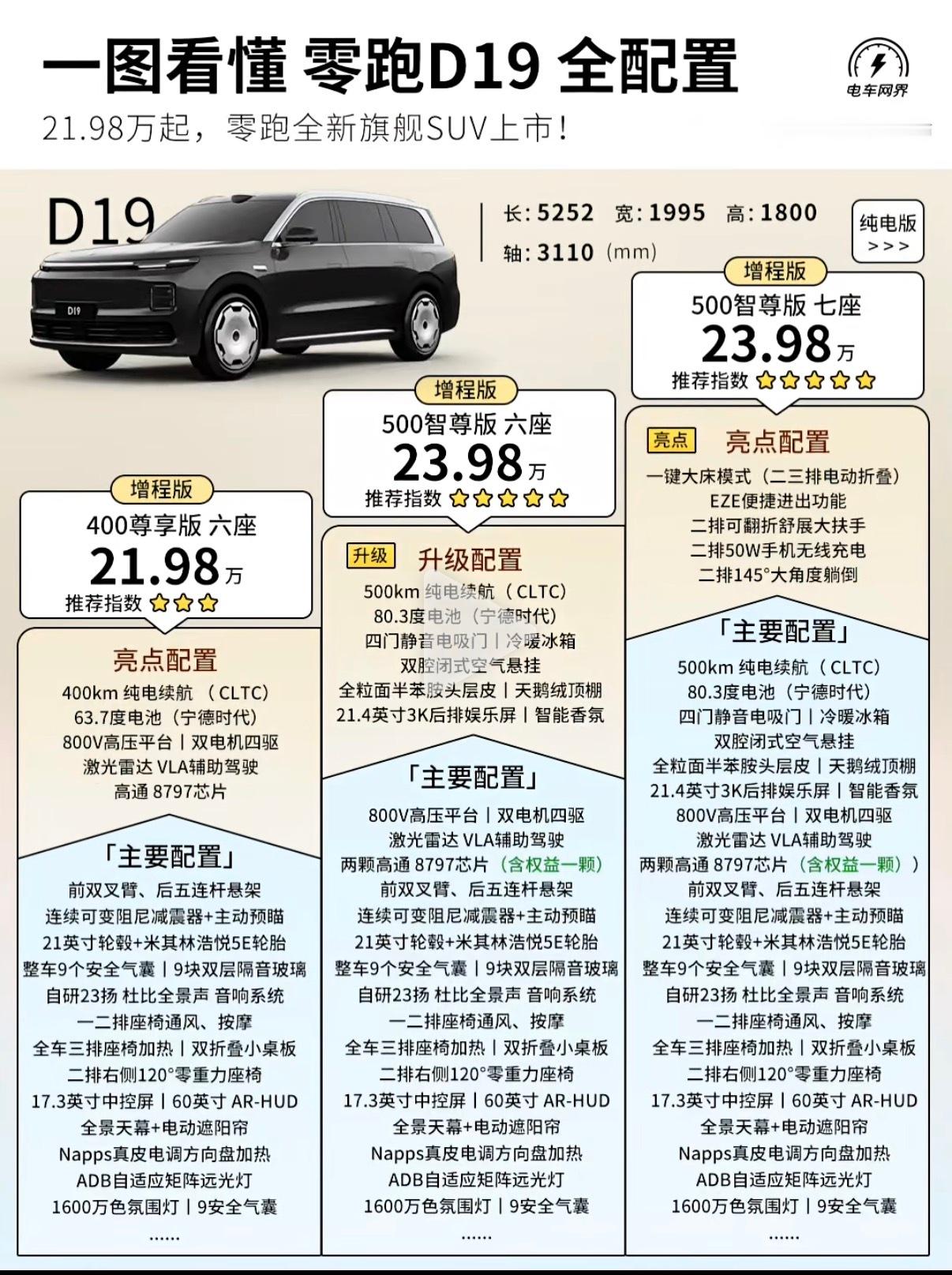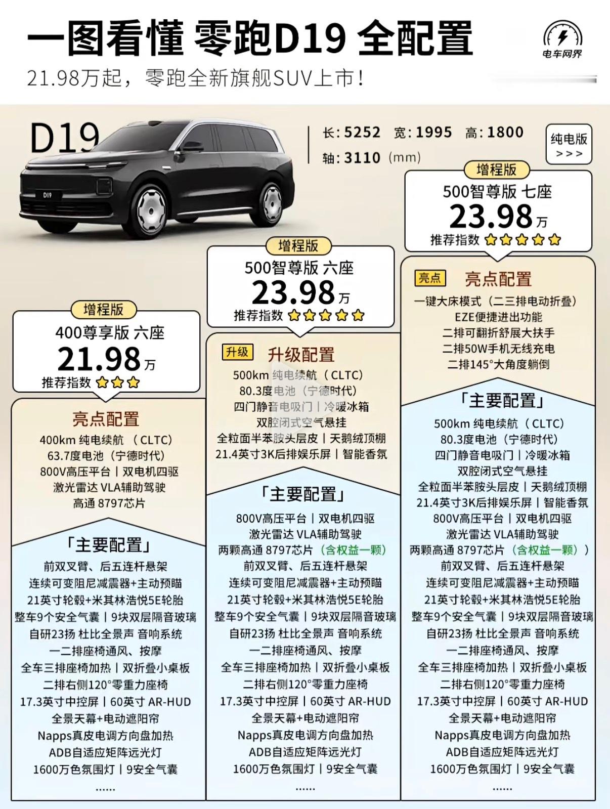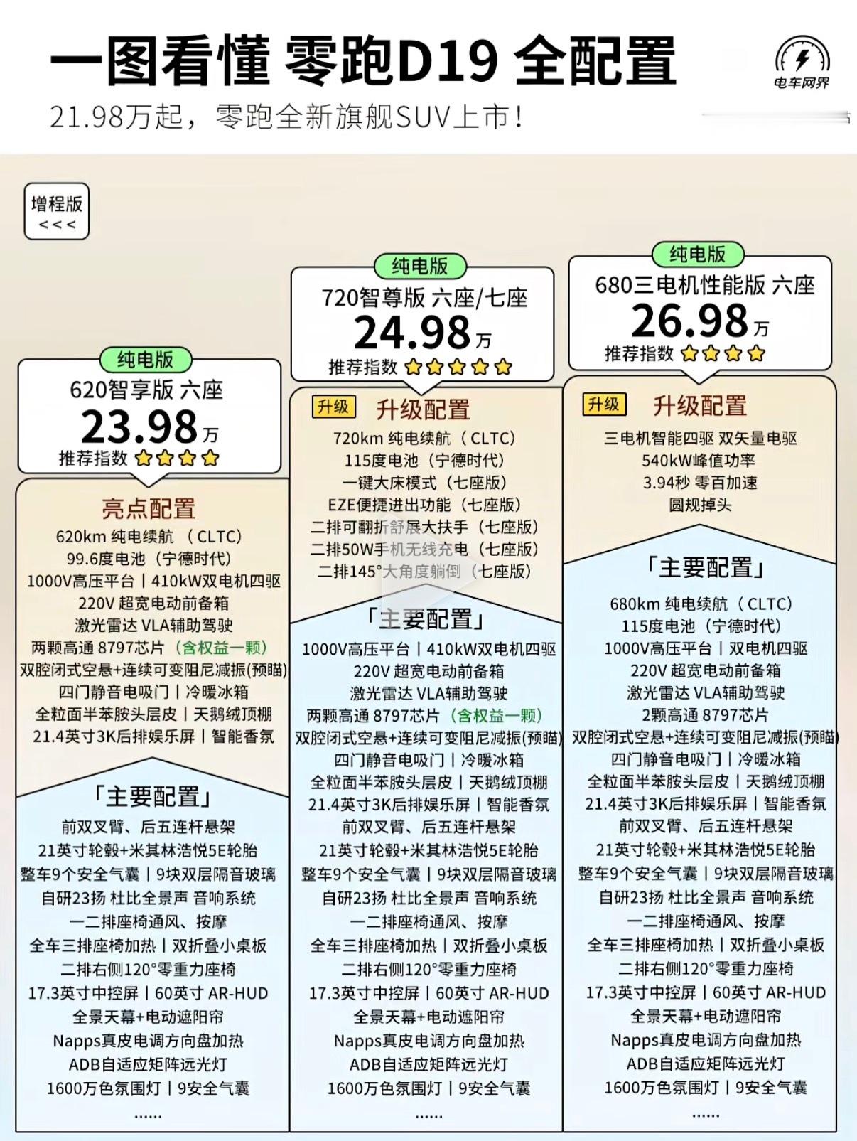 给大家附一个各个版本的配置价格对比吧,想买零跑D19的朋友们可以来参考下零跑D19满配豪华上市21.98万起