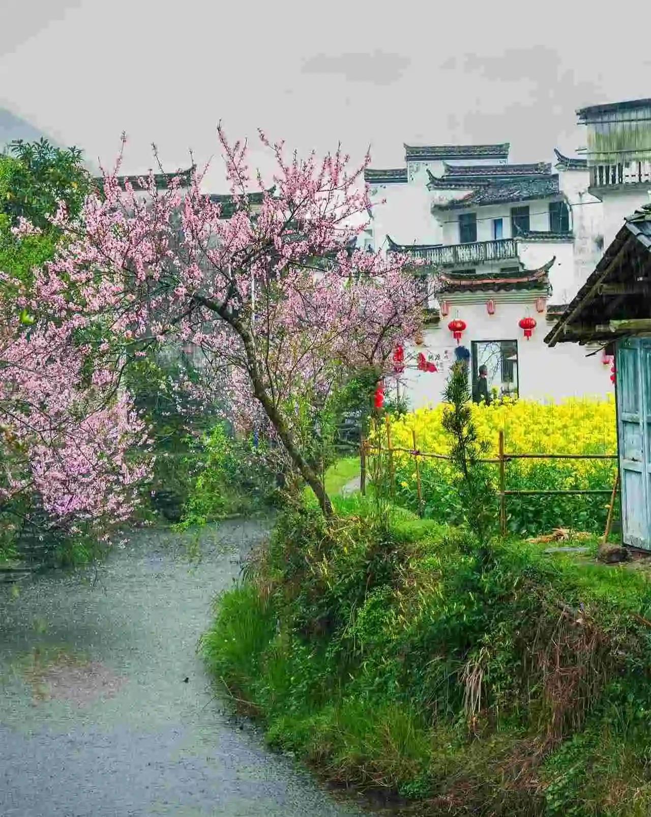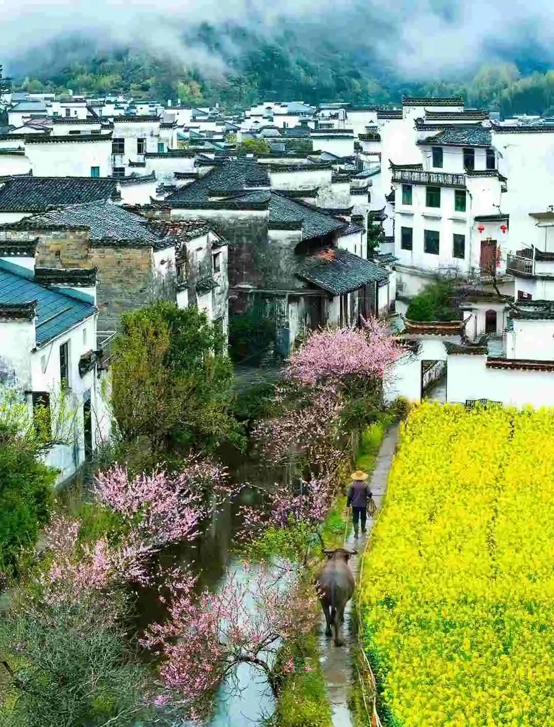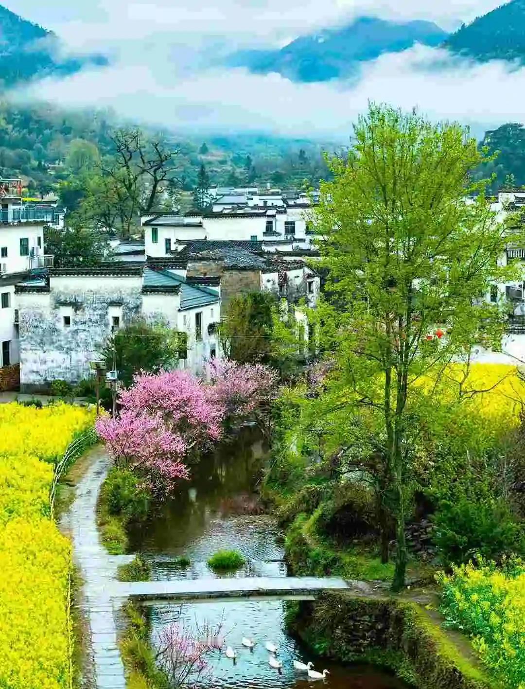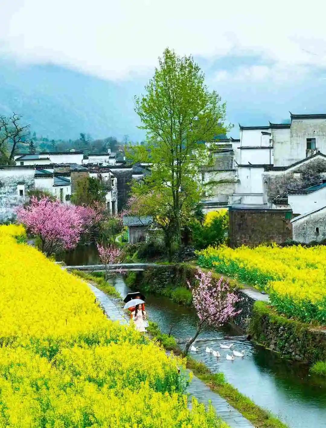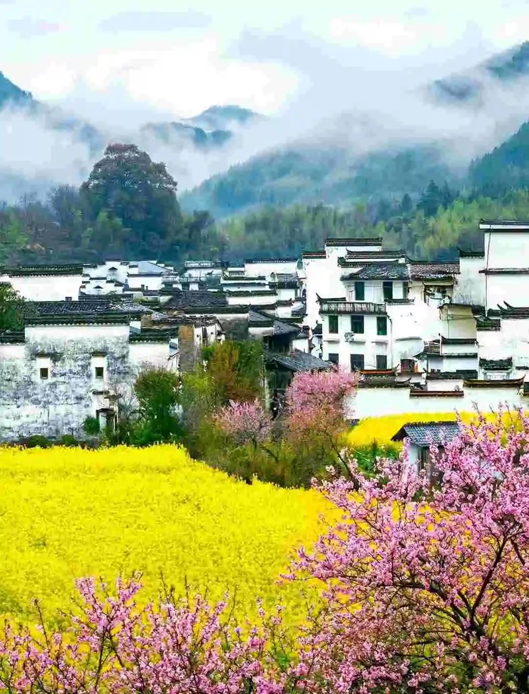 江岭是赏花代表作,2月下旬至4月上旬都能观赏。登上江岭、篁岭等地山顶,俯瞰那金黄的油菜花,摄人心魄。在月亮湾景区,桃花、山茶花与油菜花竞相绽放,粉墙黛瓦的民宿错落其间,勾勒出江南春日山居图。婺源的春色,是油菜花与远山、近水、粉墙、黛瓦构成的唯美画卷,太值得一去!