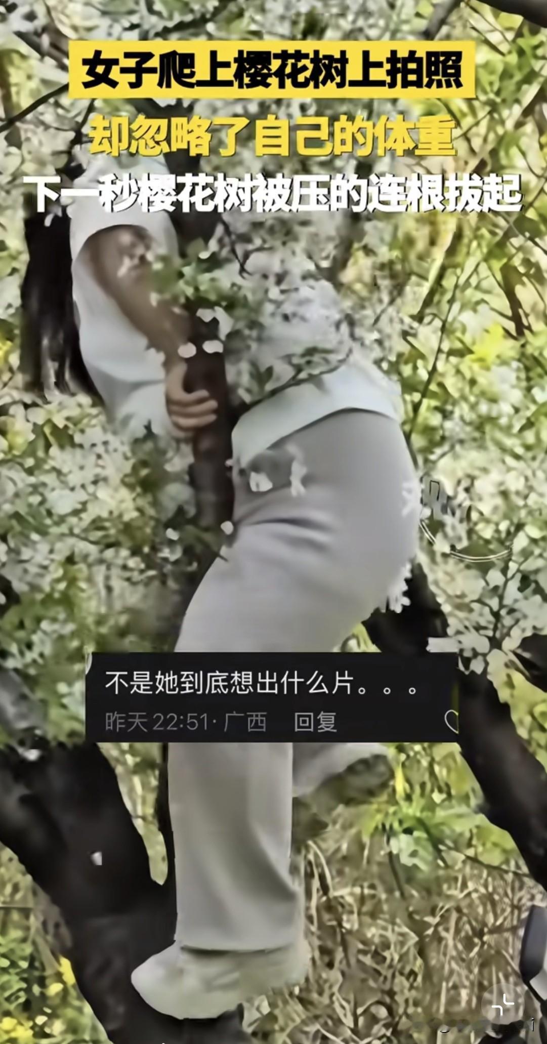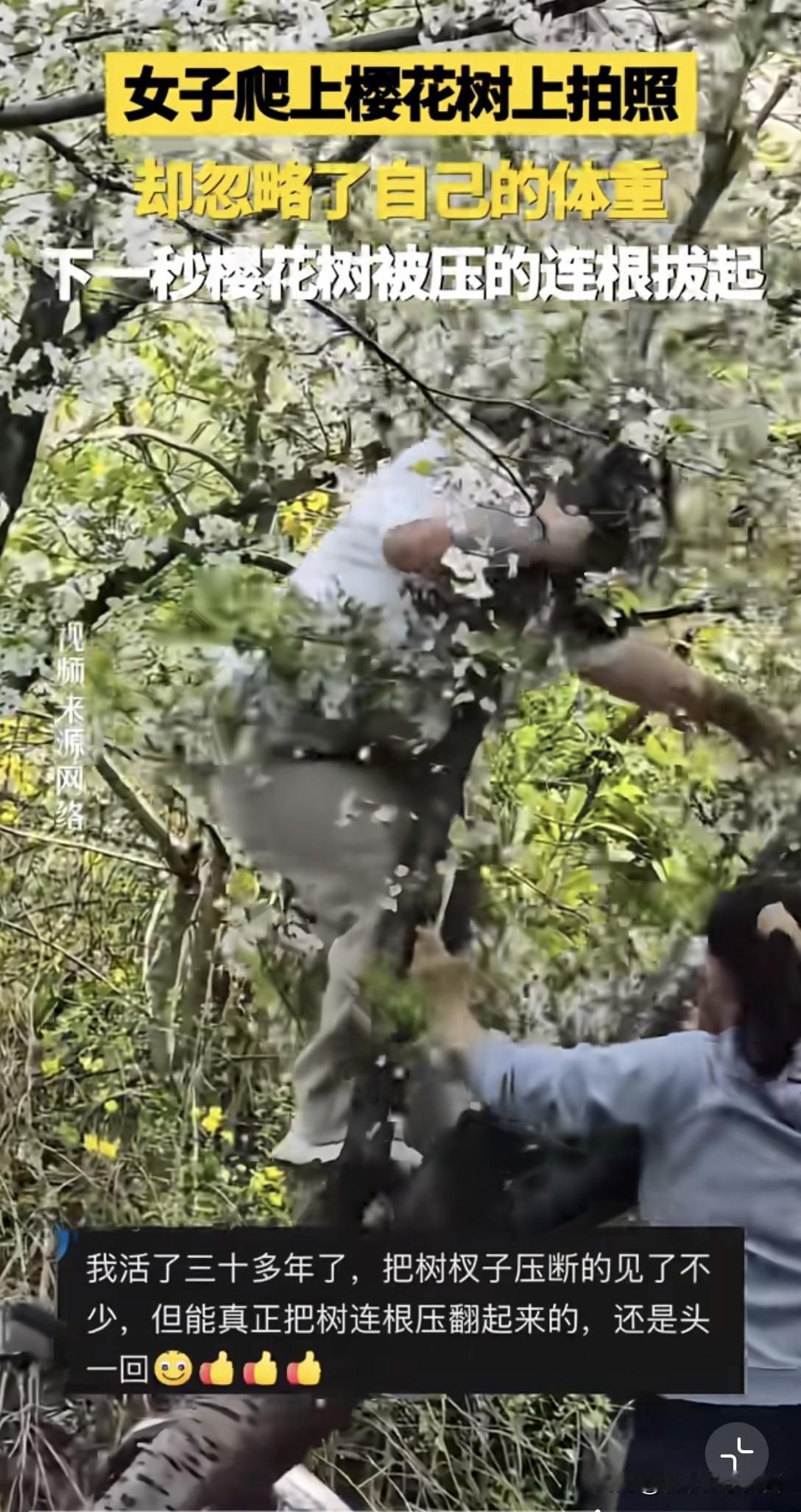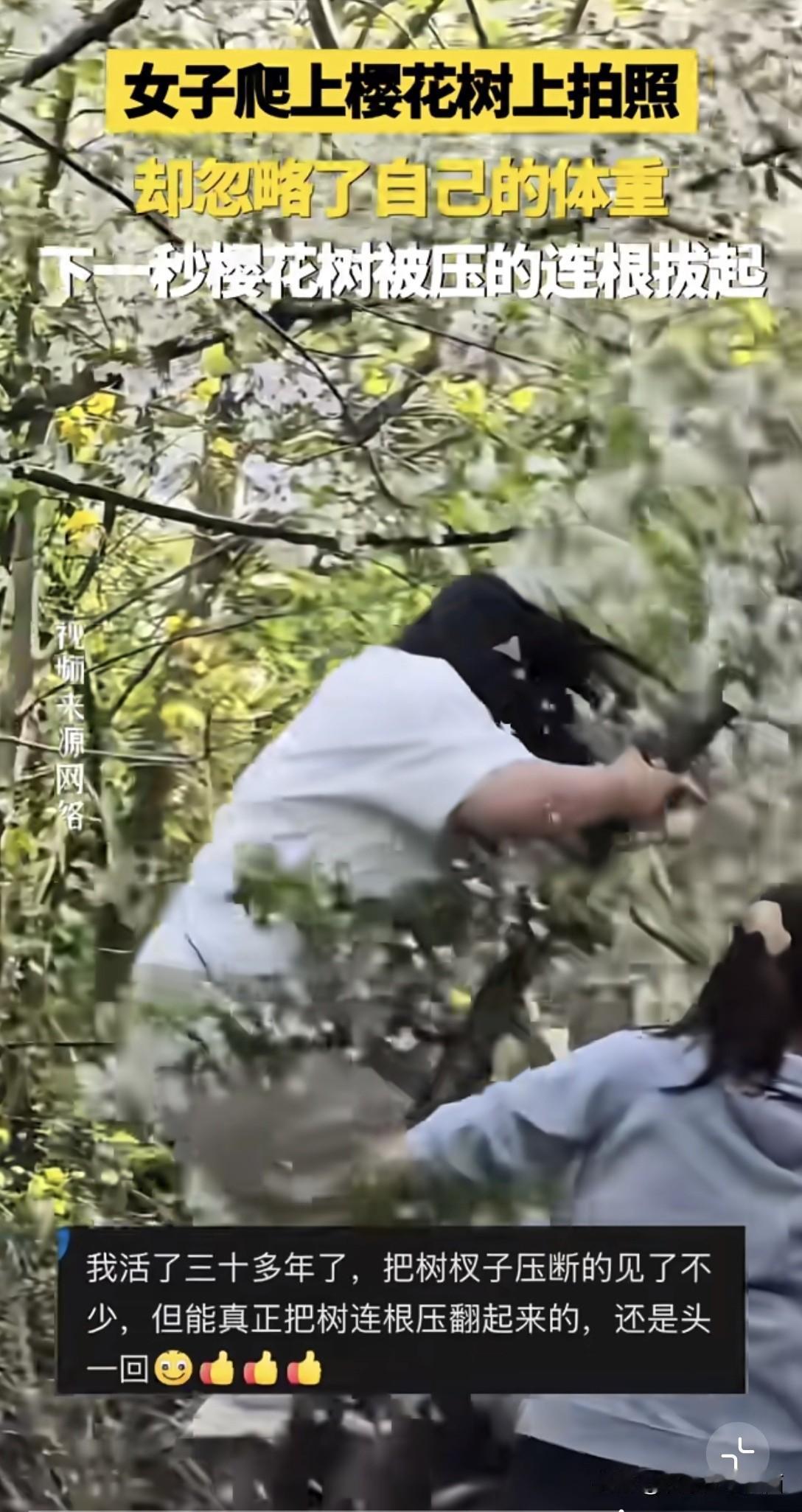春日生活打卡季 春日里,樱花树本是浪漫的象征,可总有一些让人哭笑不得的事儿发生。就像这压塌樱花树的一幕,别人鲁智深倒拔垂杨柳,她倒好,直接给树来了个“泰山压顶”。爬上树从时,估计是被春日美景冲昏了头,忘了考虑自己体重这回事儿。