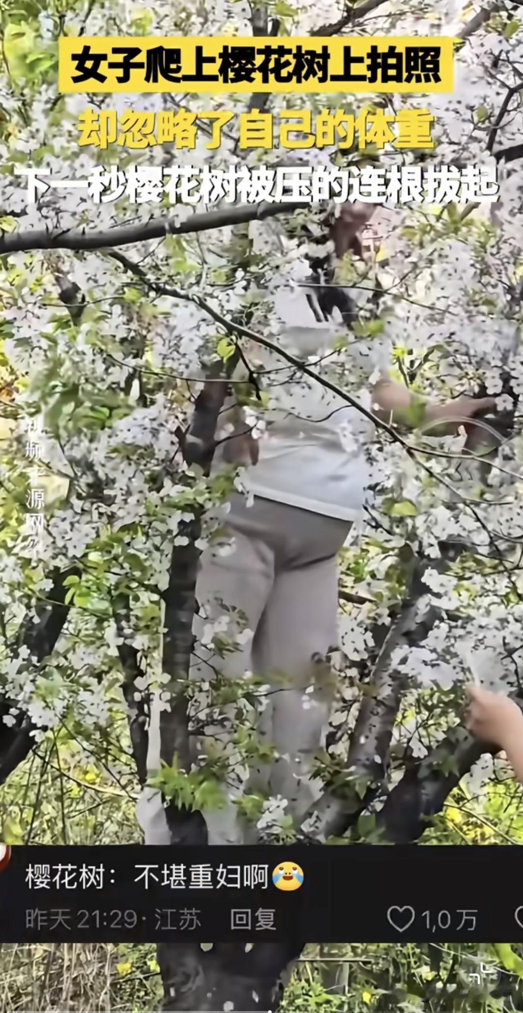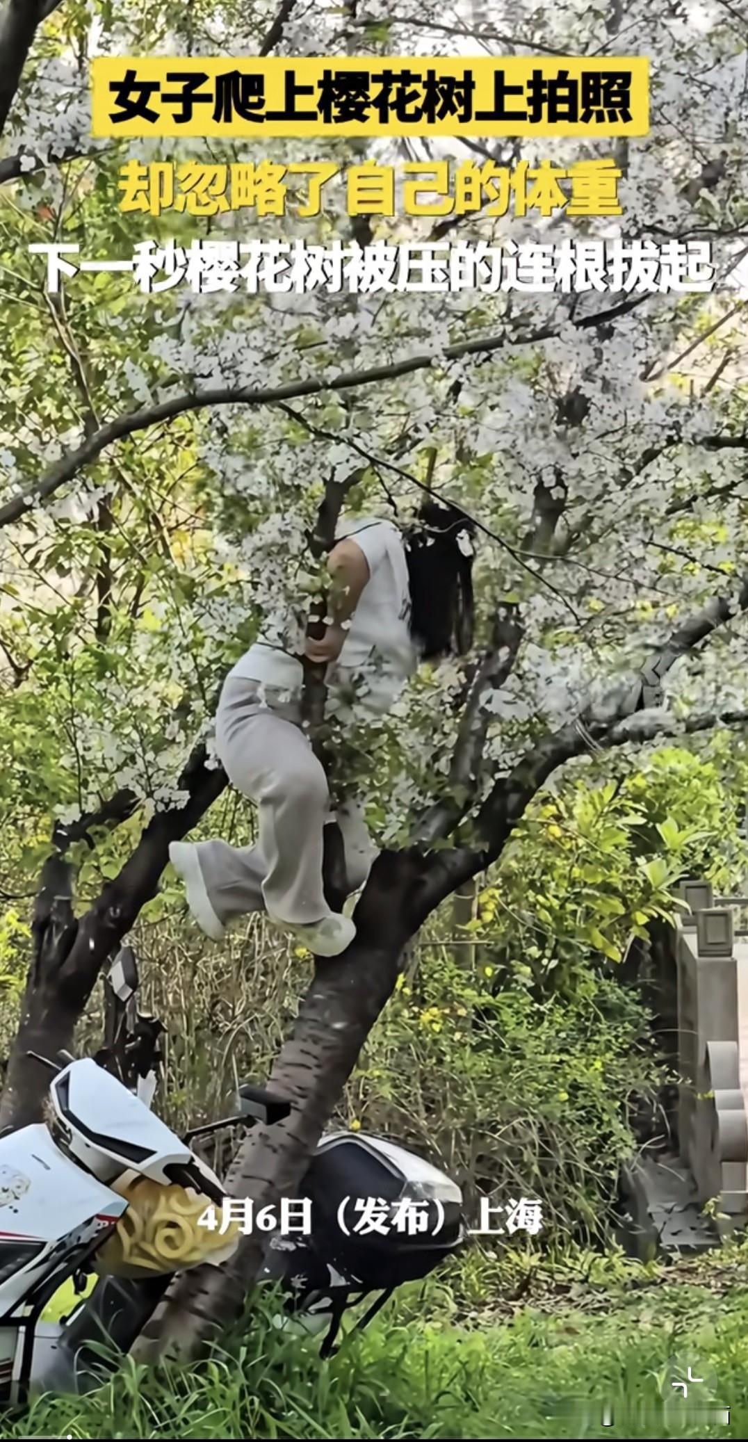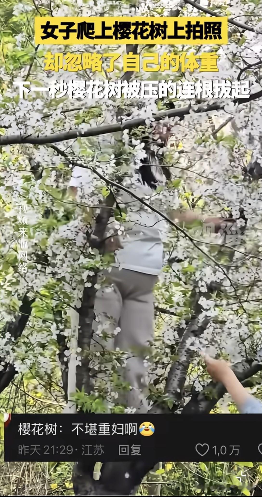 春日生活打卡季 春日里,樱花树本是浪漫的象征,可总有一些让人哭笑不得的事儿发生。就像这压塌樱花树的一幕,别人鲁智深倒拔垂杨柳,她倒好,直接给树来了个“泰山压顶”。爬上树从时,估计是被春日美景冲昏了头,忘了考虑自己体重这回事儿。