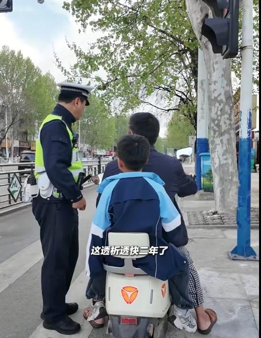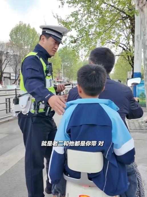 视频中,一名男子骑着电动车带着穿校服的小孩子,正好被皮哥看见拦住,问他头盔呢?
