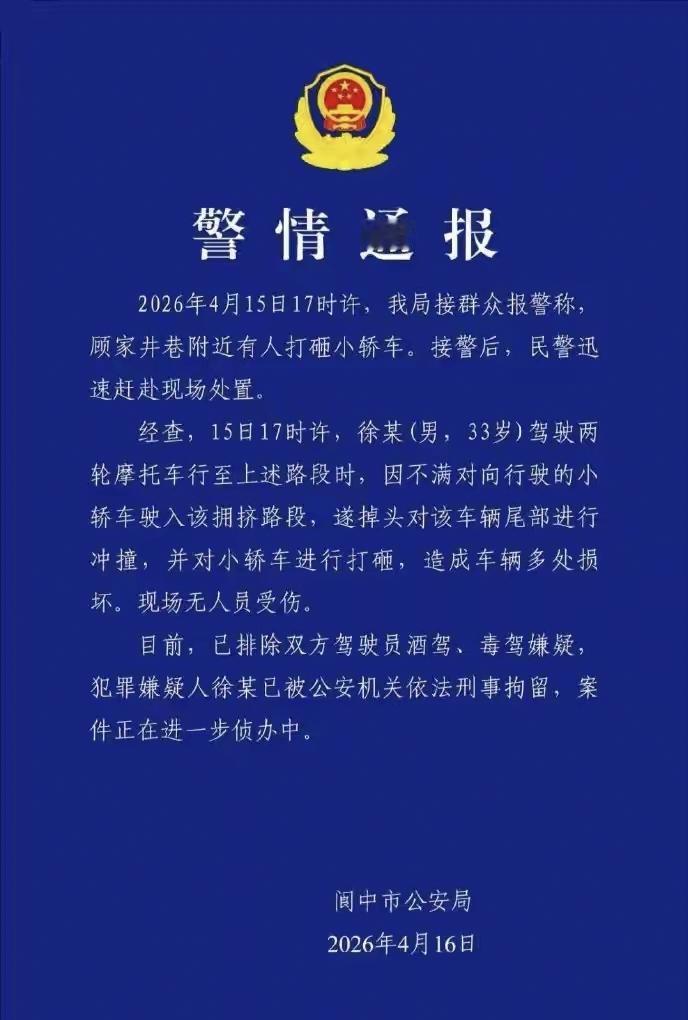2026年4月15日17时许,四川阆中发生了一起打砸小轿车事件。