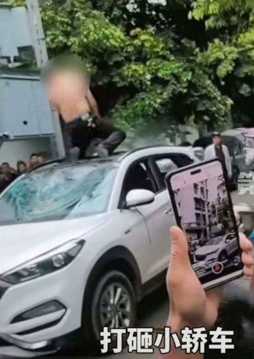 据多位网友拍摄的视频显示,一名男子光着上身,站在一辆小轿车上,疯狂踩踏,并且手持利器打砸小轿车。