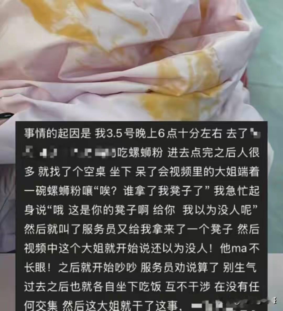 一个小小的误会,只是错拿了凳子,何必在背后搞如此的小动作呢?吃过螺蛳粉的都知道,那个汤汁,特别是辣椒油,味道大且非常难洗,螺蛳粉的味道可是喜欢的人挺喜欢,讨厌的人闻了可能会吐,尤其是在悄悄的抹在人背后,等人回了家才知道,真是心理会膈应死人。