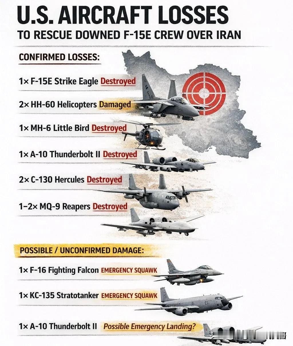 从美国媒体披露一些细节来看,为了拯救在伊朗领空被击落的F-15E的飞行员,美军可谓损失巨大,从确认的损失来看,价值至少超过5亿美金。