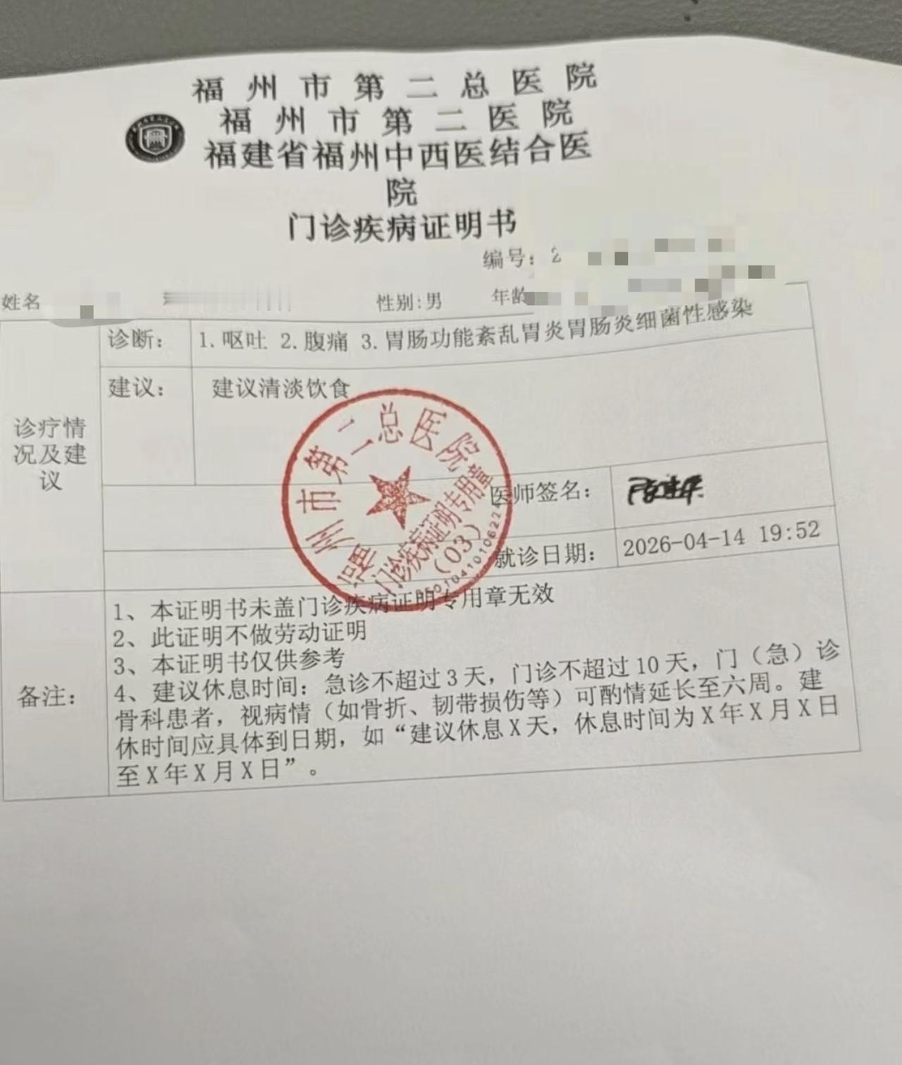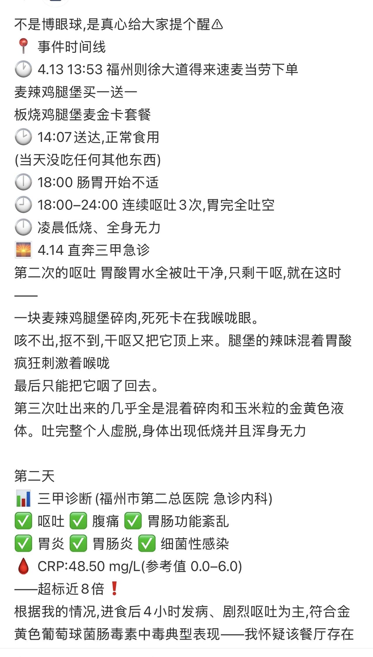 福州网友曝光:4月13日在则徐大道得来速麦当劳用餐后,出现剧烈呕吐、低烧等症状,次日就医确诊细菌性感染,CRP值48.50mg/L,超标近8倍。涉事门店经理甩锅,店长拒赔,称“赔了等于承认食品有问题”,仅用代金券打发,后续推诿失联。