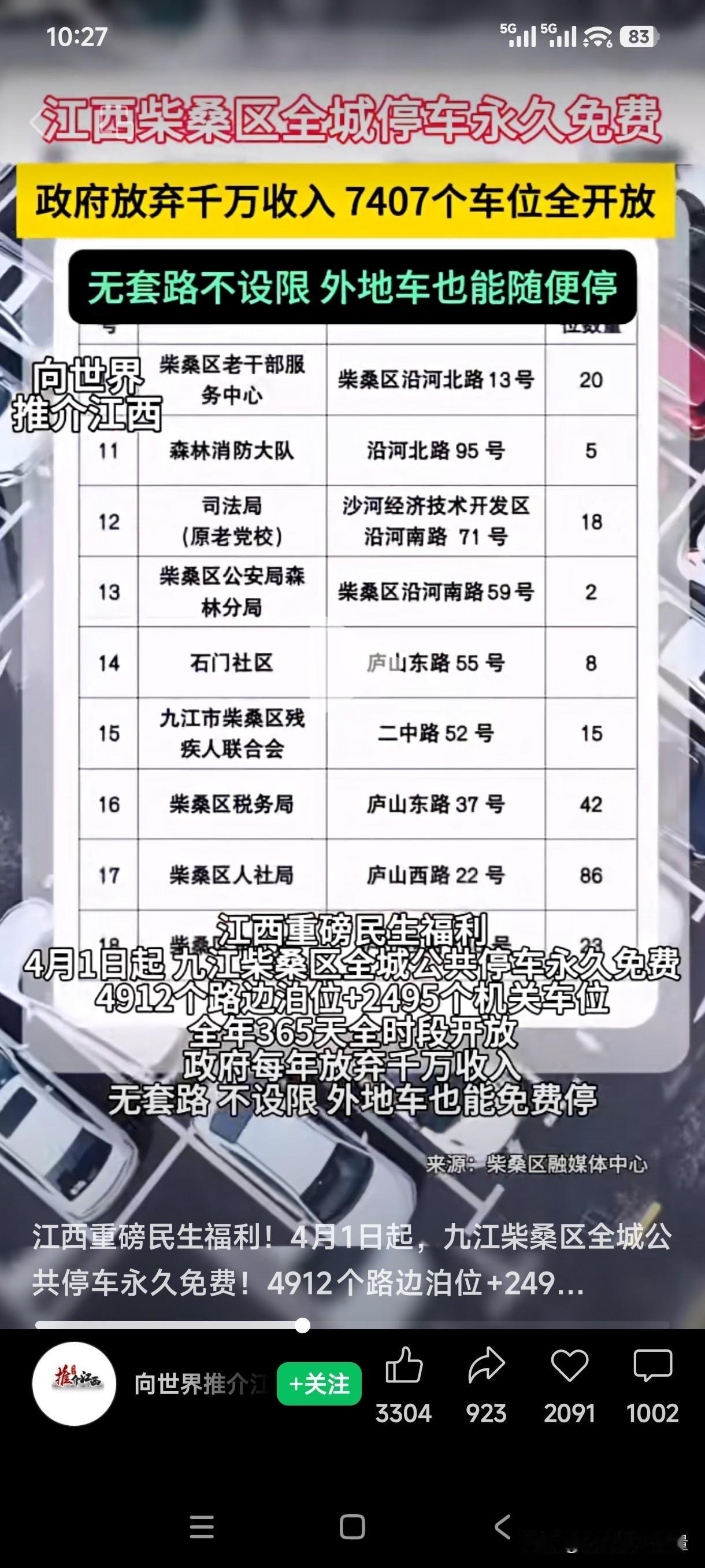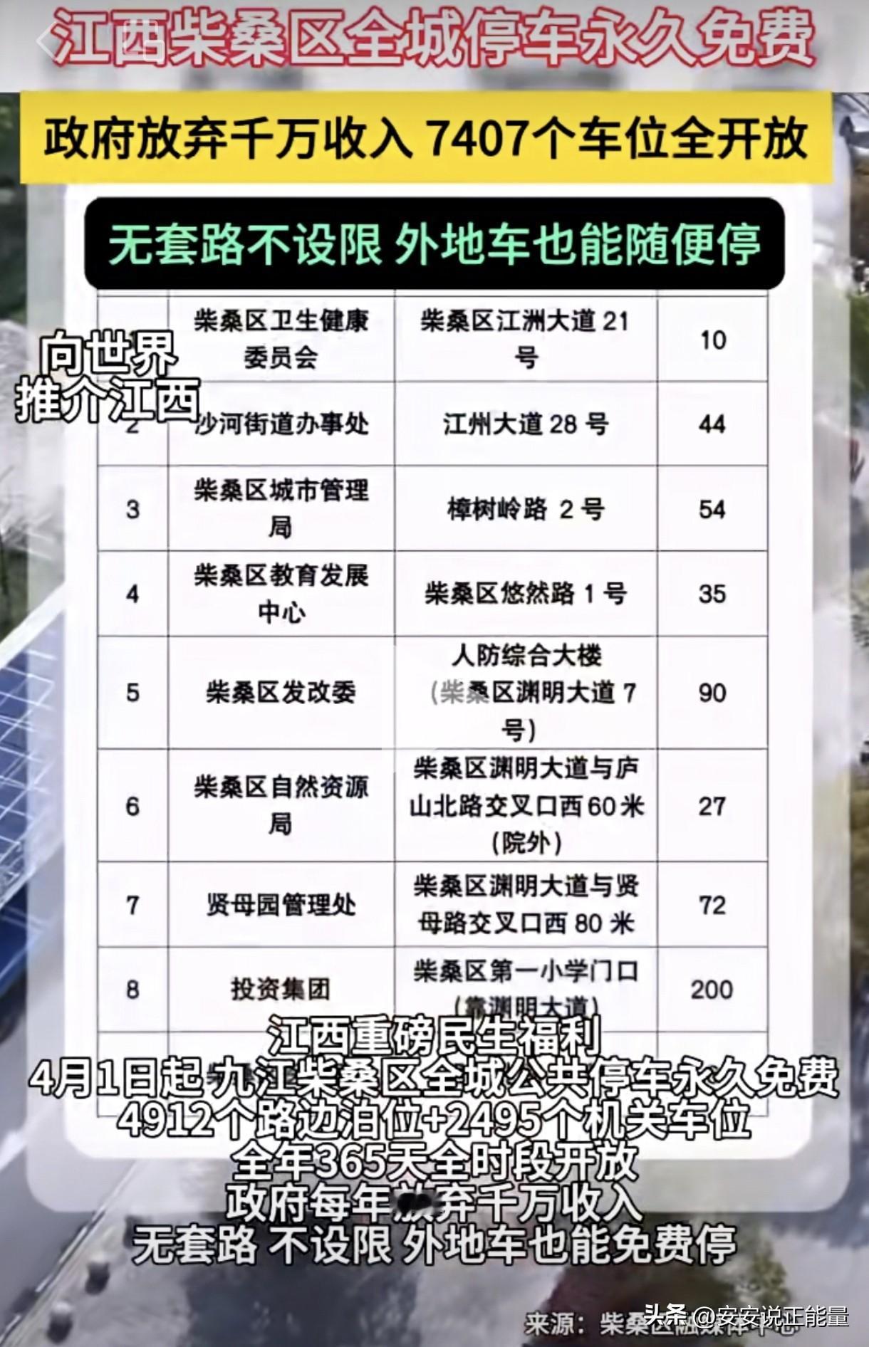 全城停车位永久免费停车!当其他地方还在想着法子搞慧泊停车收费的时候,江西柴桑区却反其道而行,直接将城区4912个路边泊车位和2495个机关停车位免费对外开放。对!你没有听错,是全年365天全时段免费开放,没有套路,没有限制,不管是外地车还是本地车,都可以免费停车。
