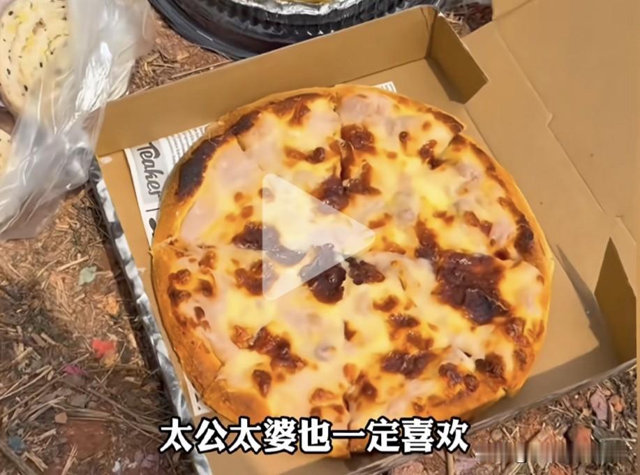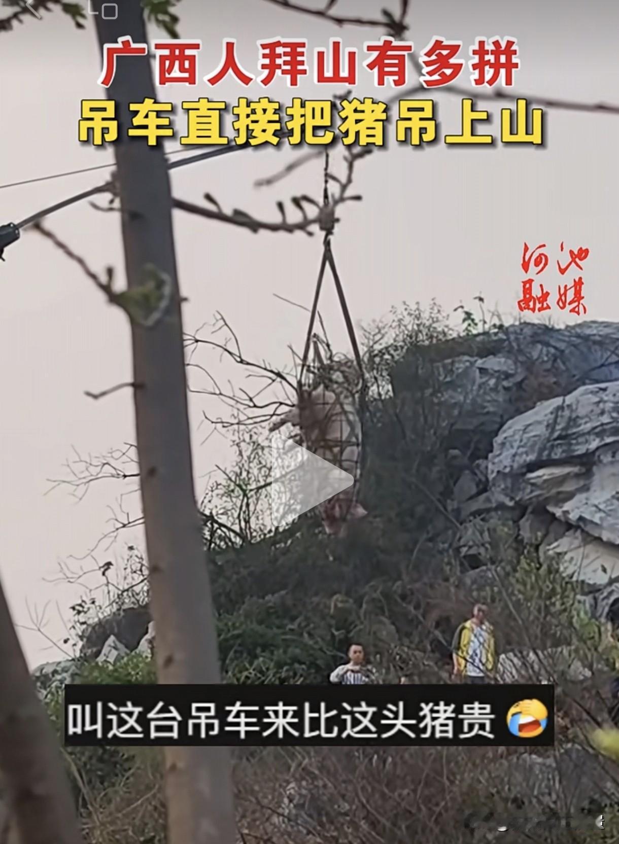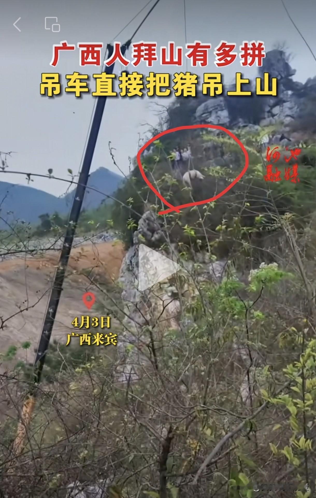 当广西00后成为清明祭祖的主力,画风就有点盖不住了。几十斤的大音响直接扛上山,薯条、炸鸡、披萨、奶茶、汉堡,他们最喜欢的零食全部拿到山上给太爷太奶吃。当然也有本地美食雨声,直接在山上现场切。更为夸张的是,有人直接请吊机将一头大活猪吊到山上祭拜祖先。