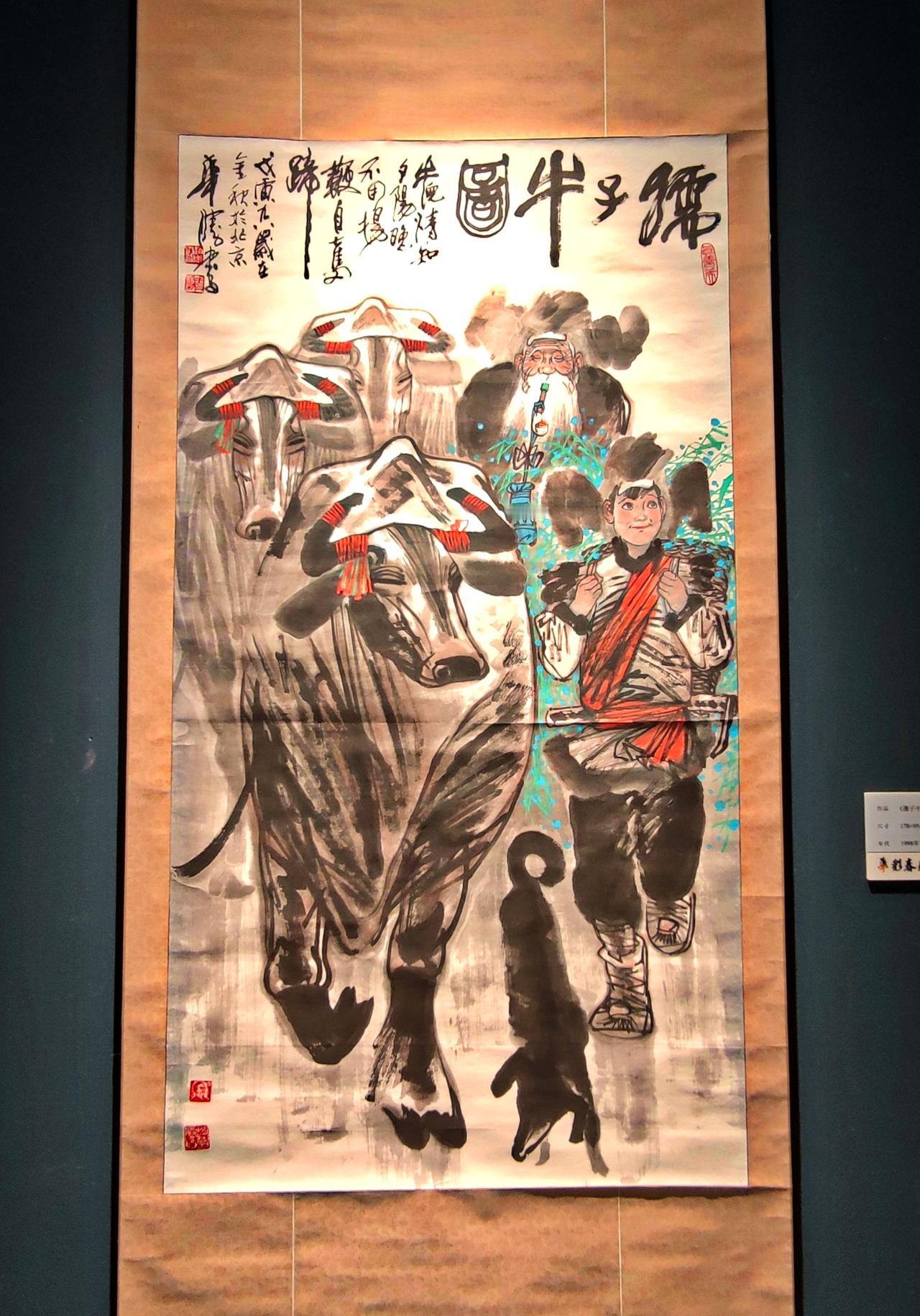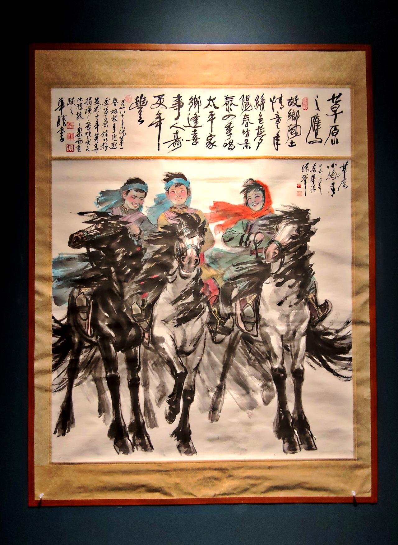 ″华彩春秋一一赵华胜先生艺术创作纪念展″,在《辽宁美术馆》举行。赵华胜是关东画派领军人物、曾任辽宁美术馆馆长,图为展出的作品《盛世》、《孺子牛》、《草原之鹰》、《我们这一代》。