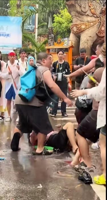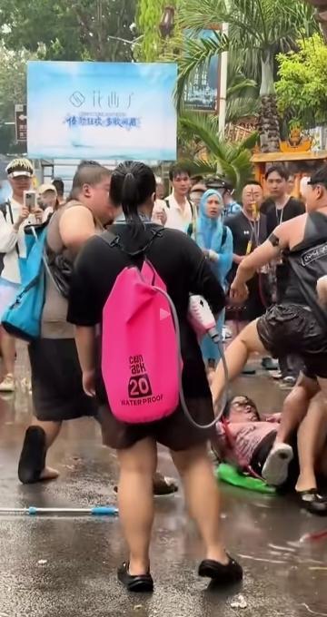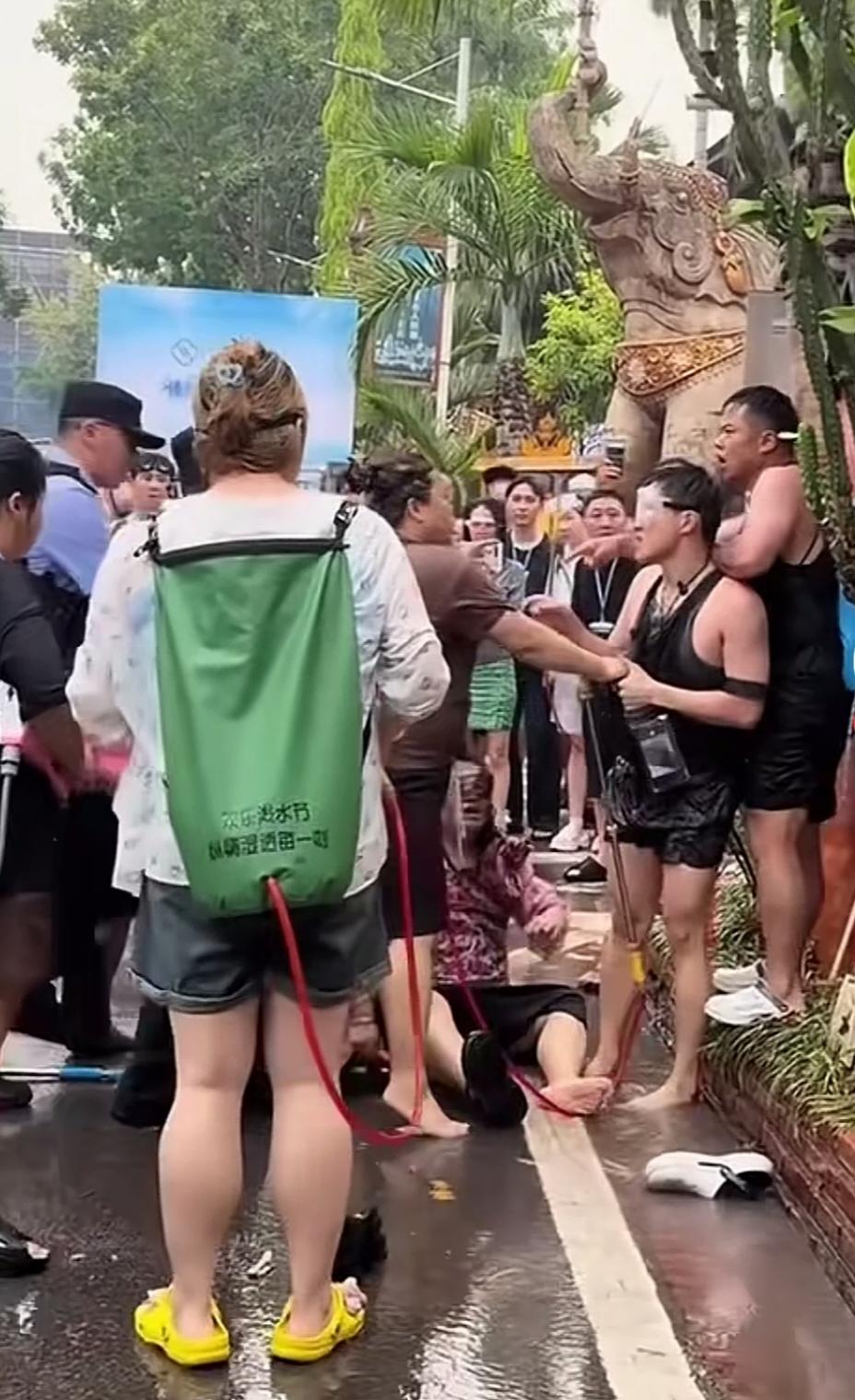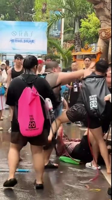 正在这时,一位同样背水枪的高大威猛强壮男子,从左边冲出来,抡起拳头就对准其中一位戴防水眼镜的男士,狠狠地来了几拳,一位穿咖色衣服的女士急忙拉着戴眼镜男子靠边,然而他还不愿离开,结果,胖男士对准他的头又来了几拳!