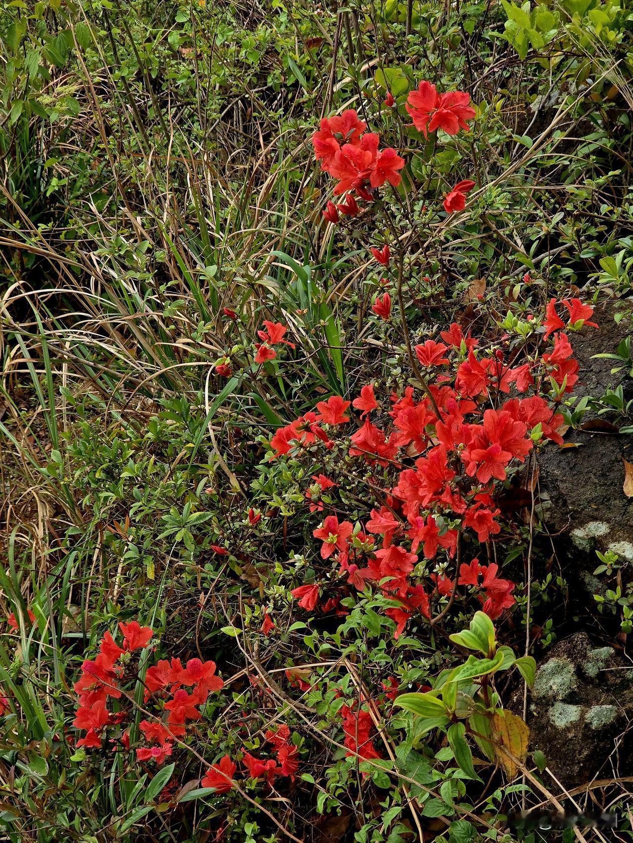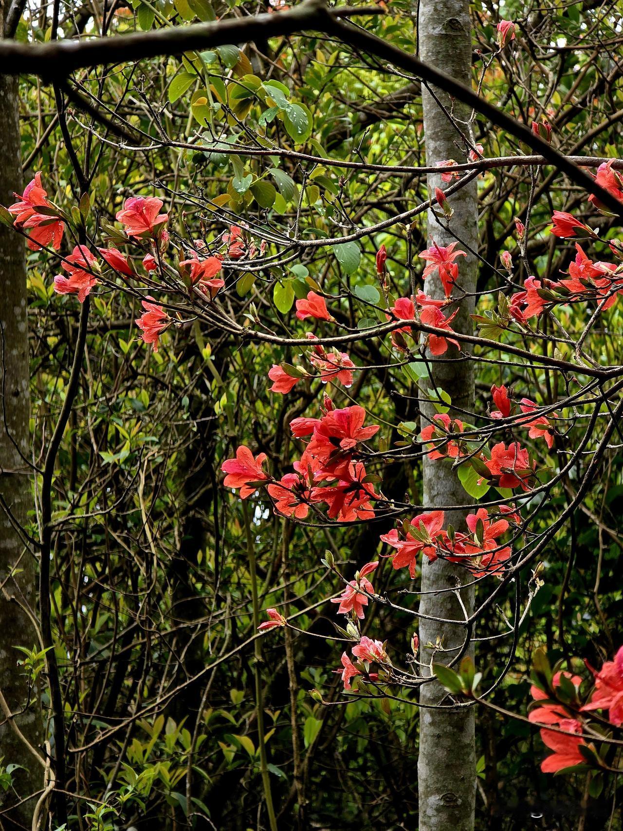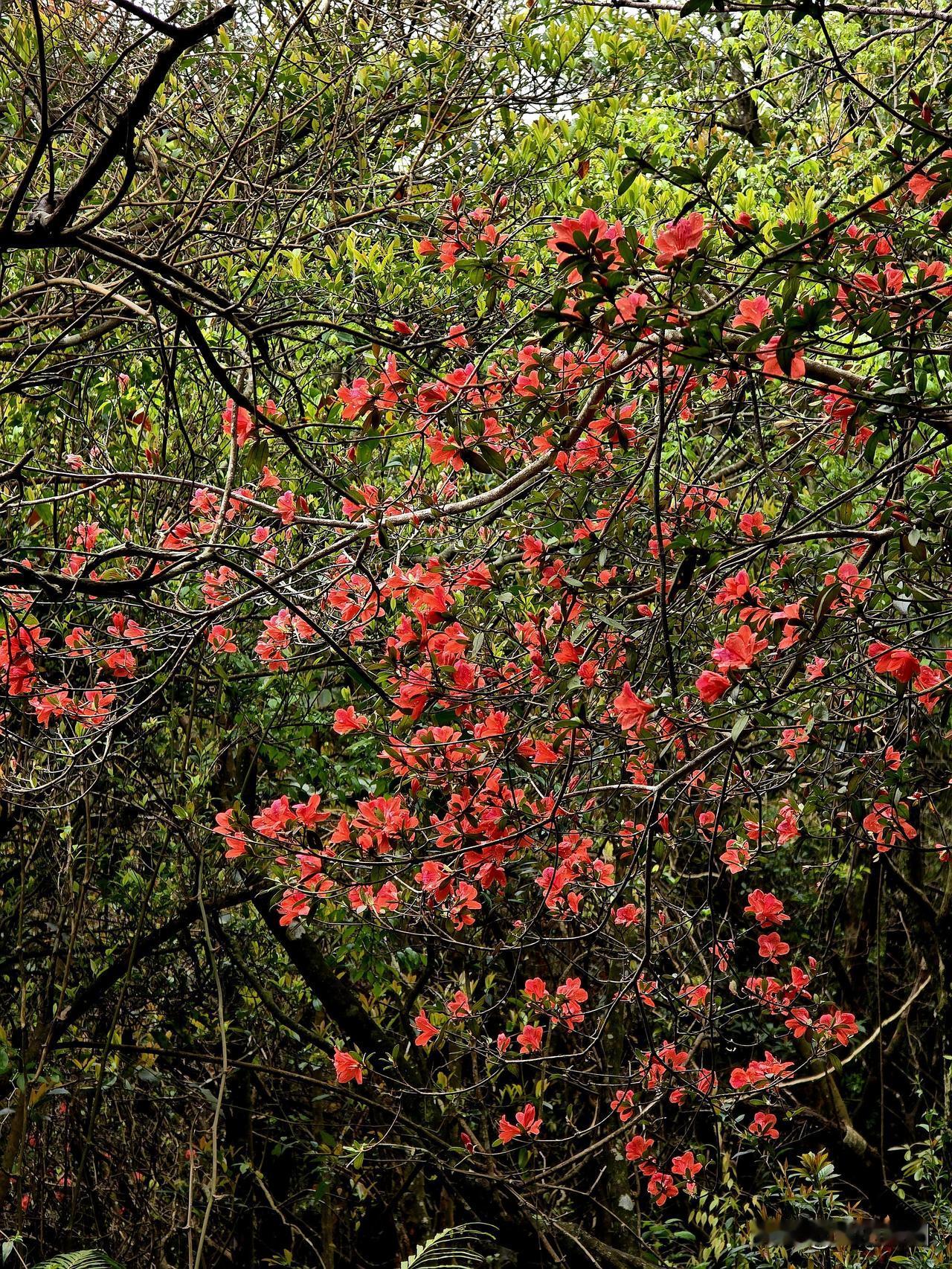 东风送暖入山峡, 满岭鹃花映彩霞。 艳蕊凝香沾雨露, 繁枝吐艳竞春华。 红燃叠嶂