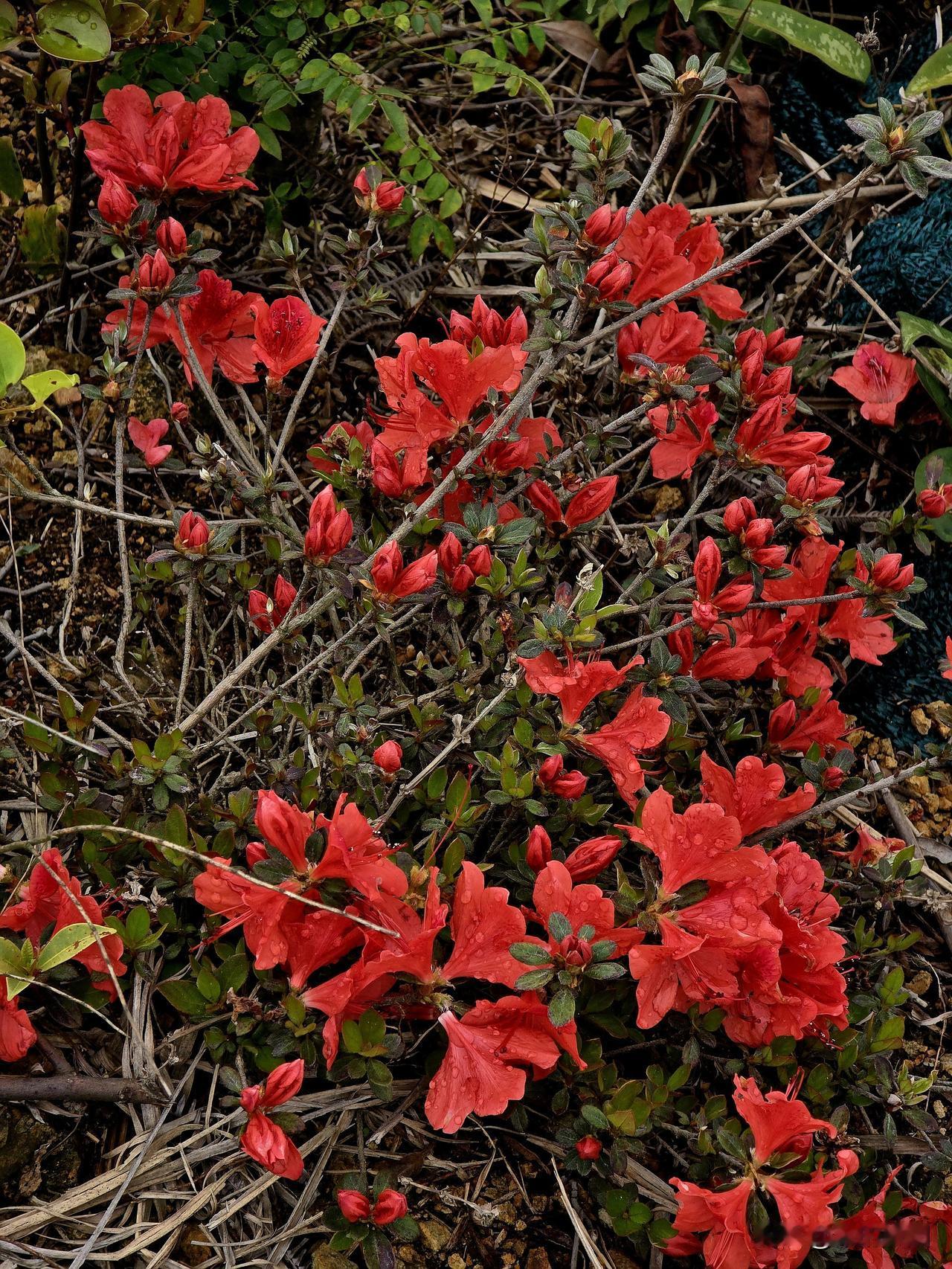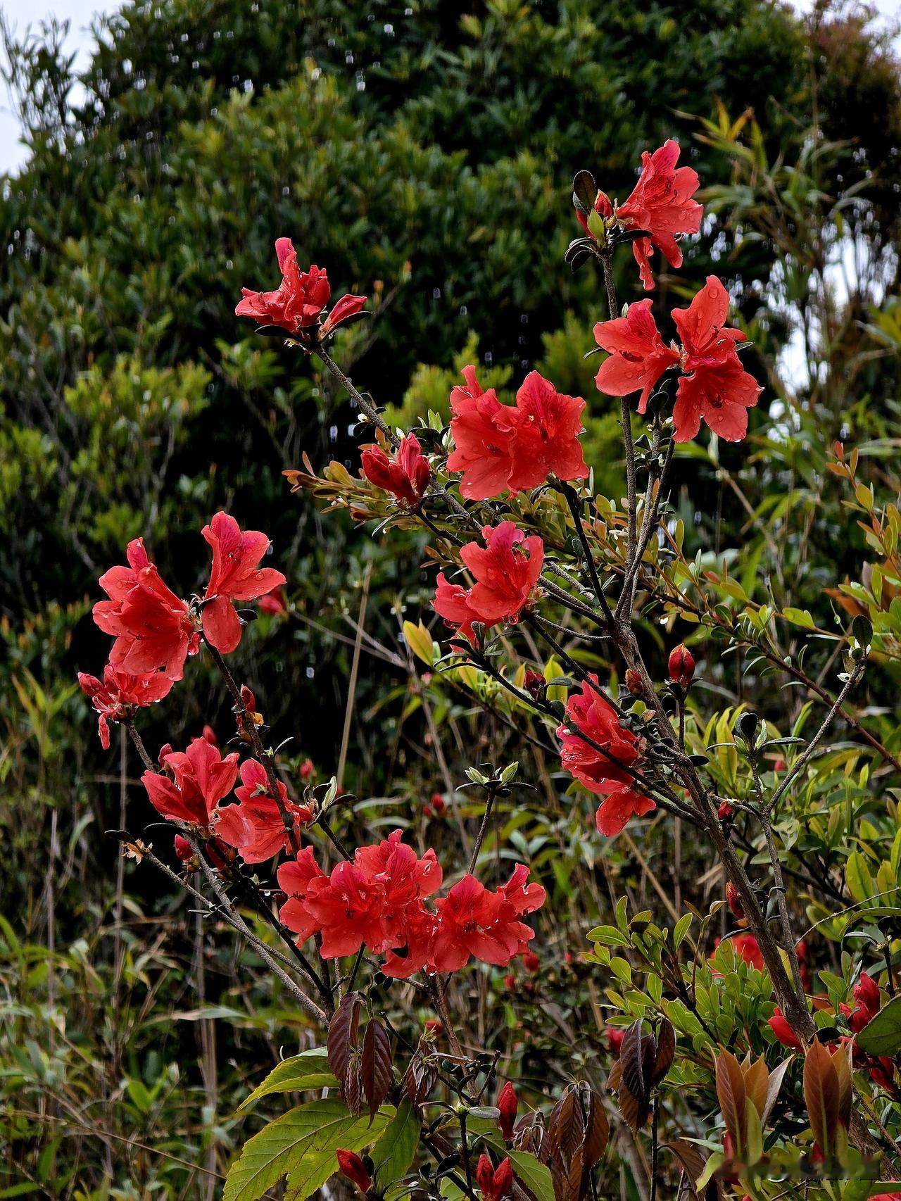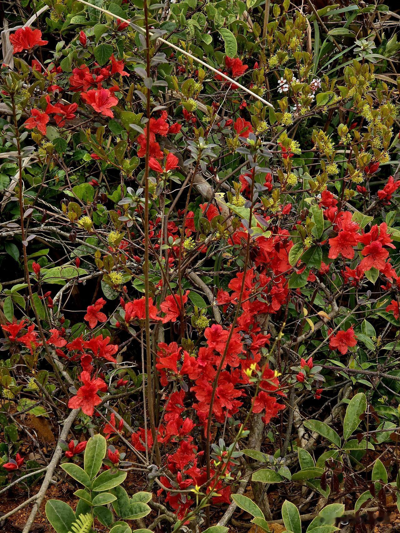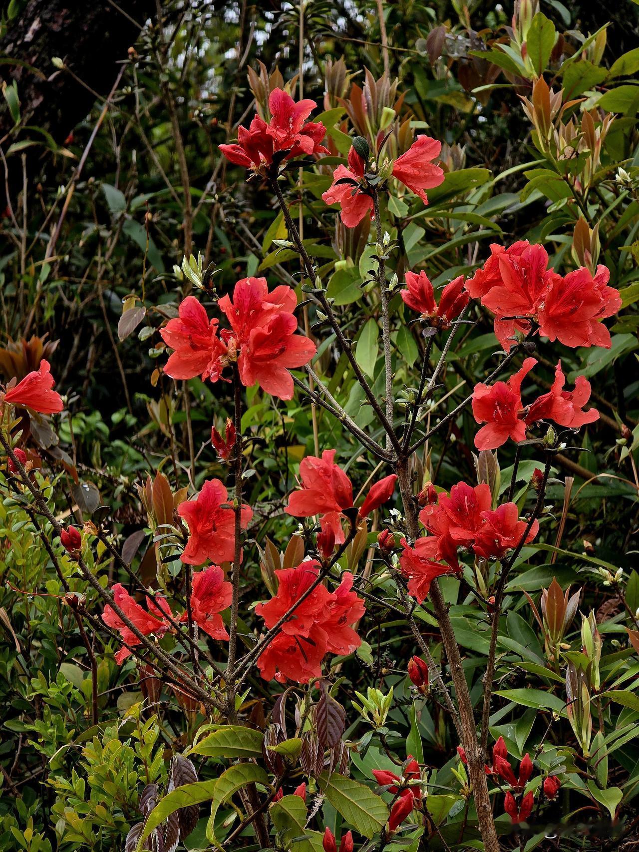 东风送暖入山峡, 满岭鹃花映彩霞。 艳蕊凝香沾雨露, 繁枝吐艳竞春华。 红燃叠嶂