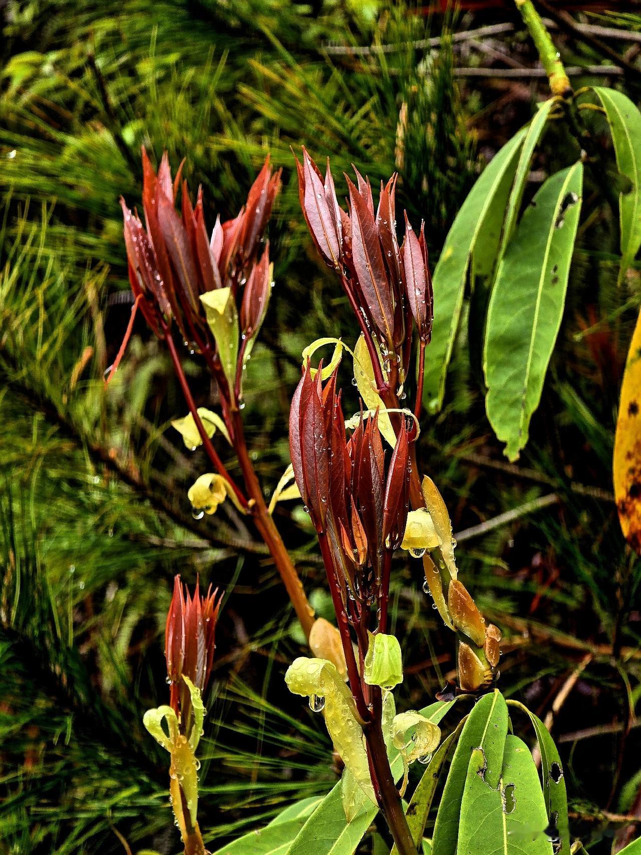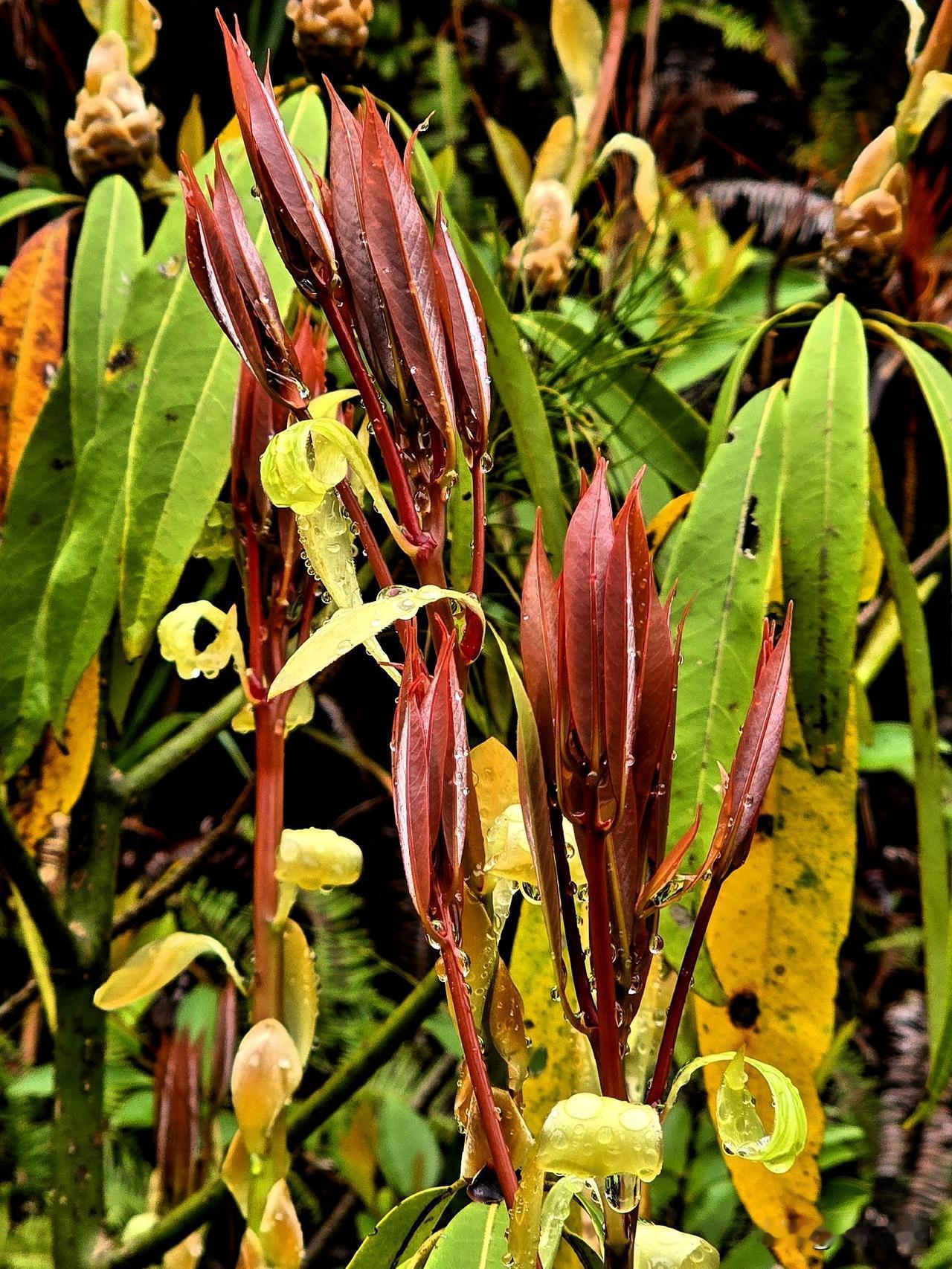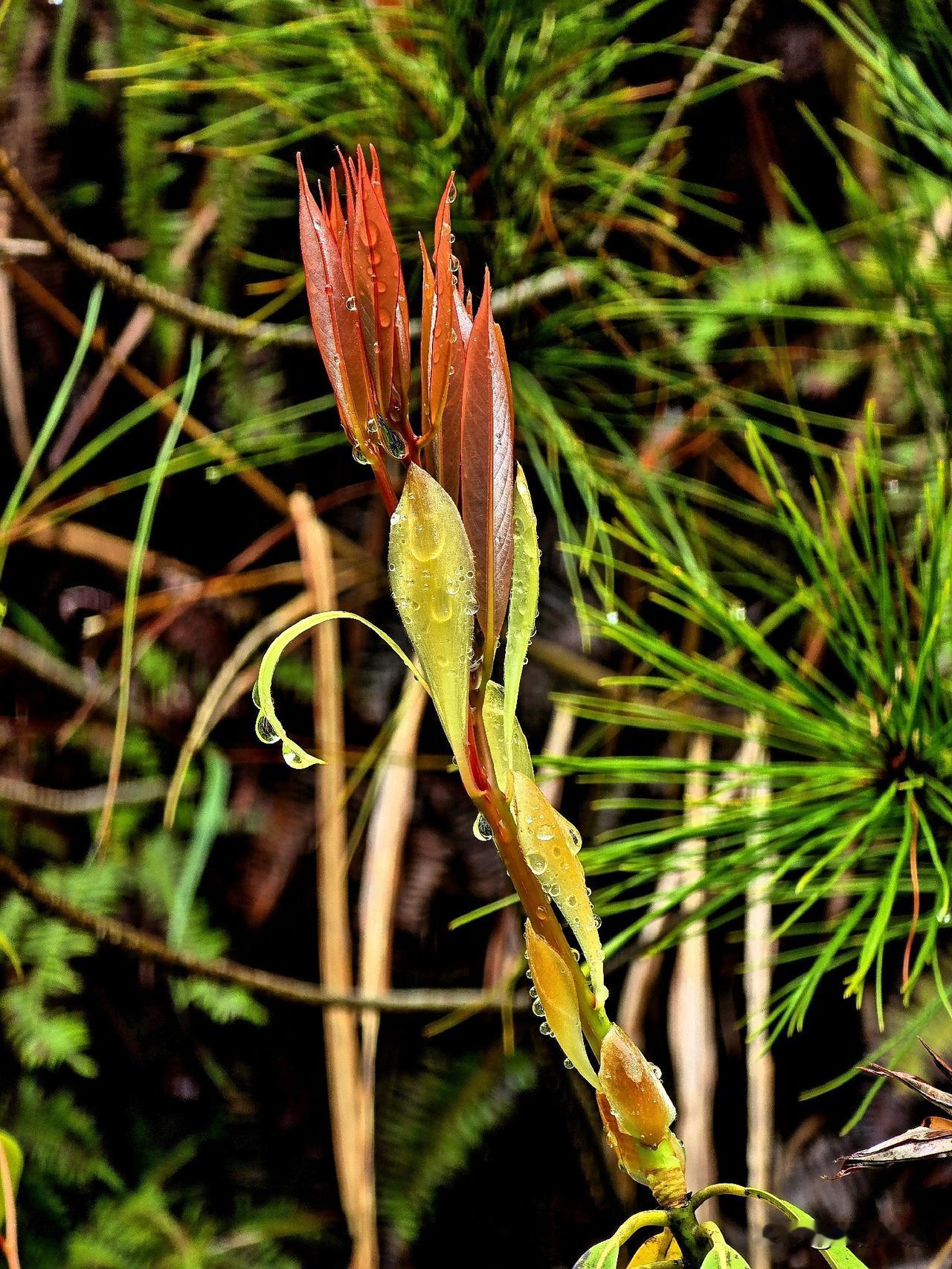 春雨新叶 细雨如丝润晓光,绛红新叶缀枝长。 珠凝翠幄轻沾露,苞褪鹅黄欲离霜。 软
