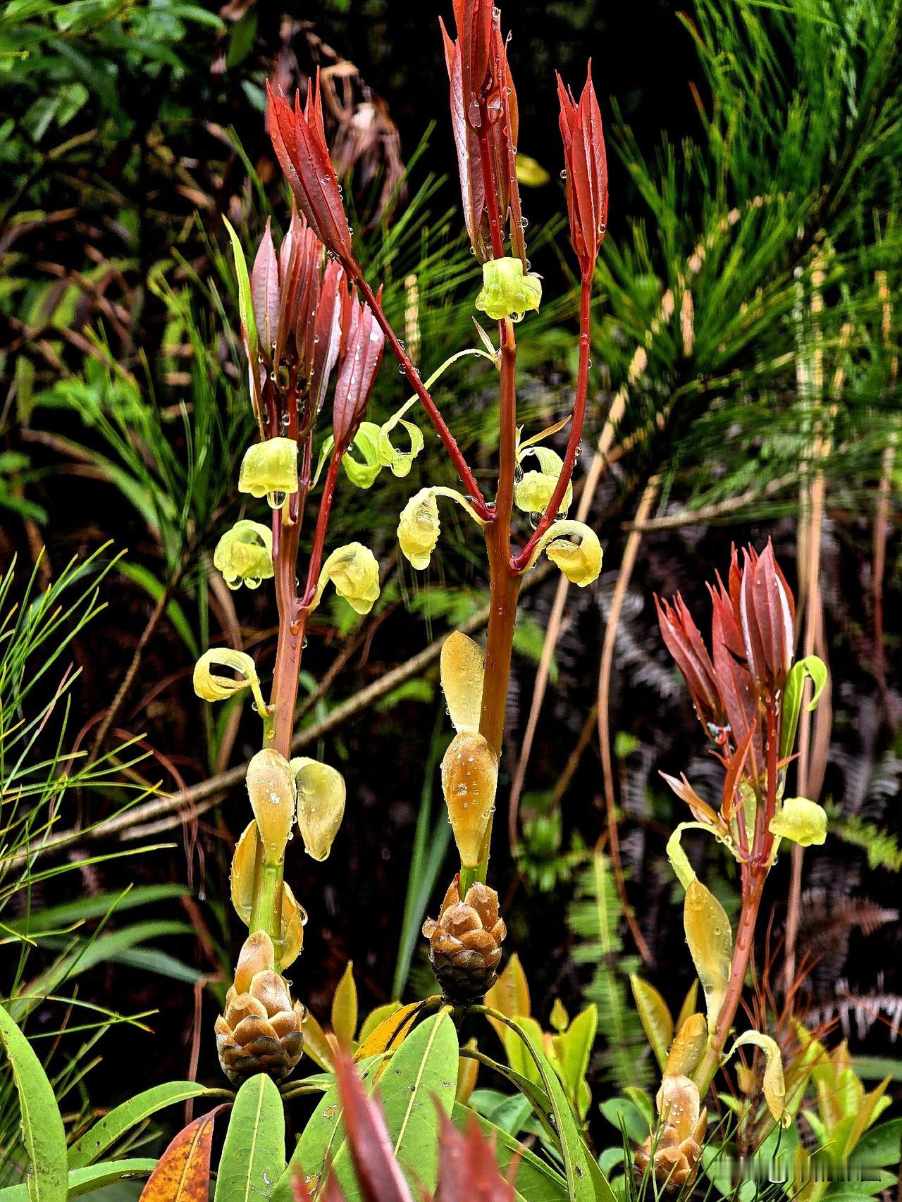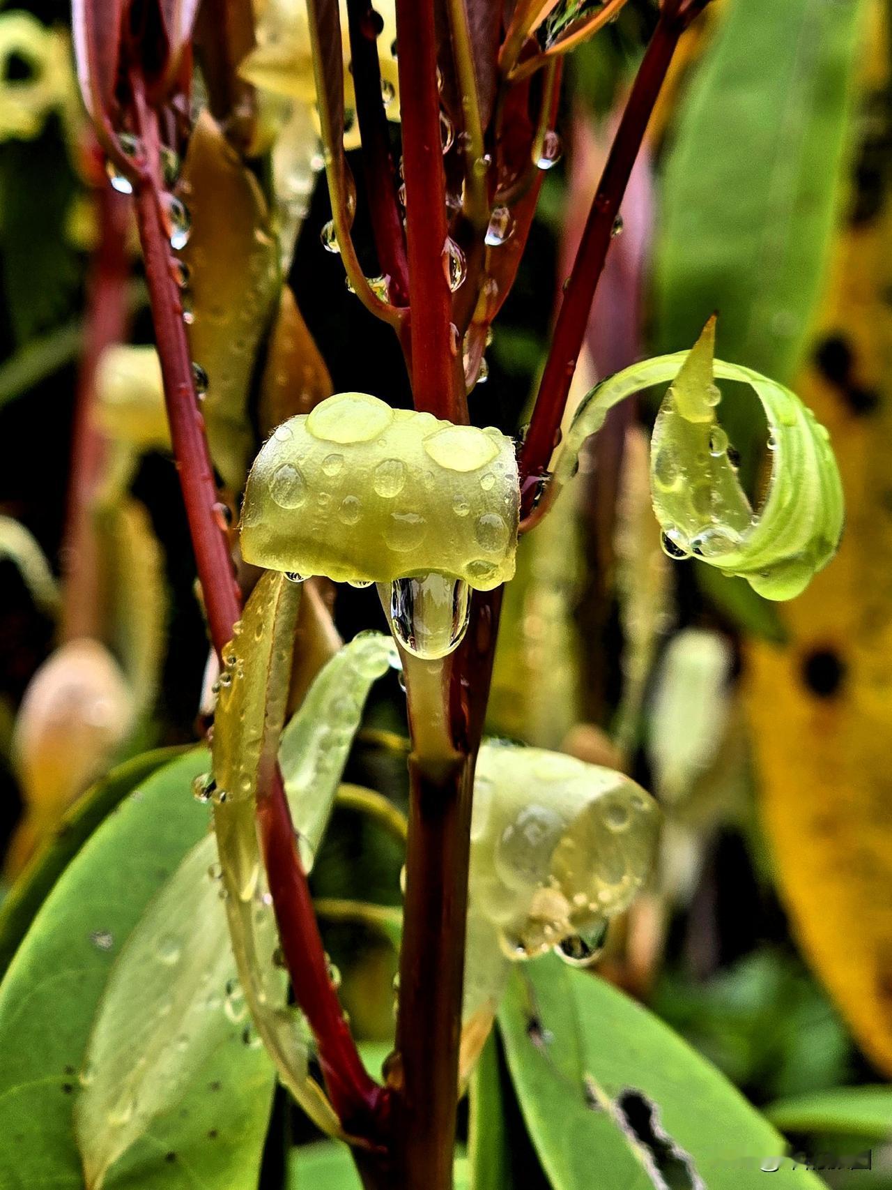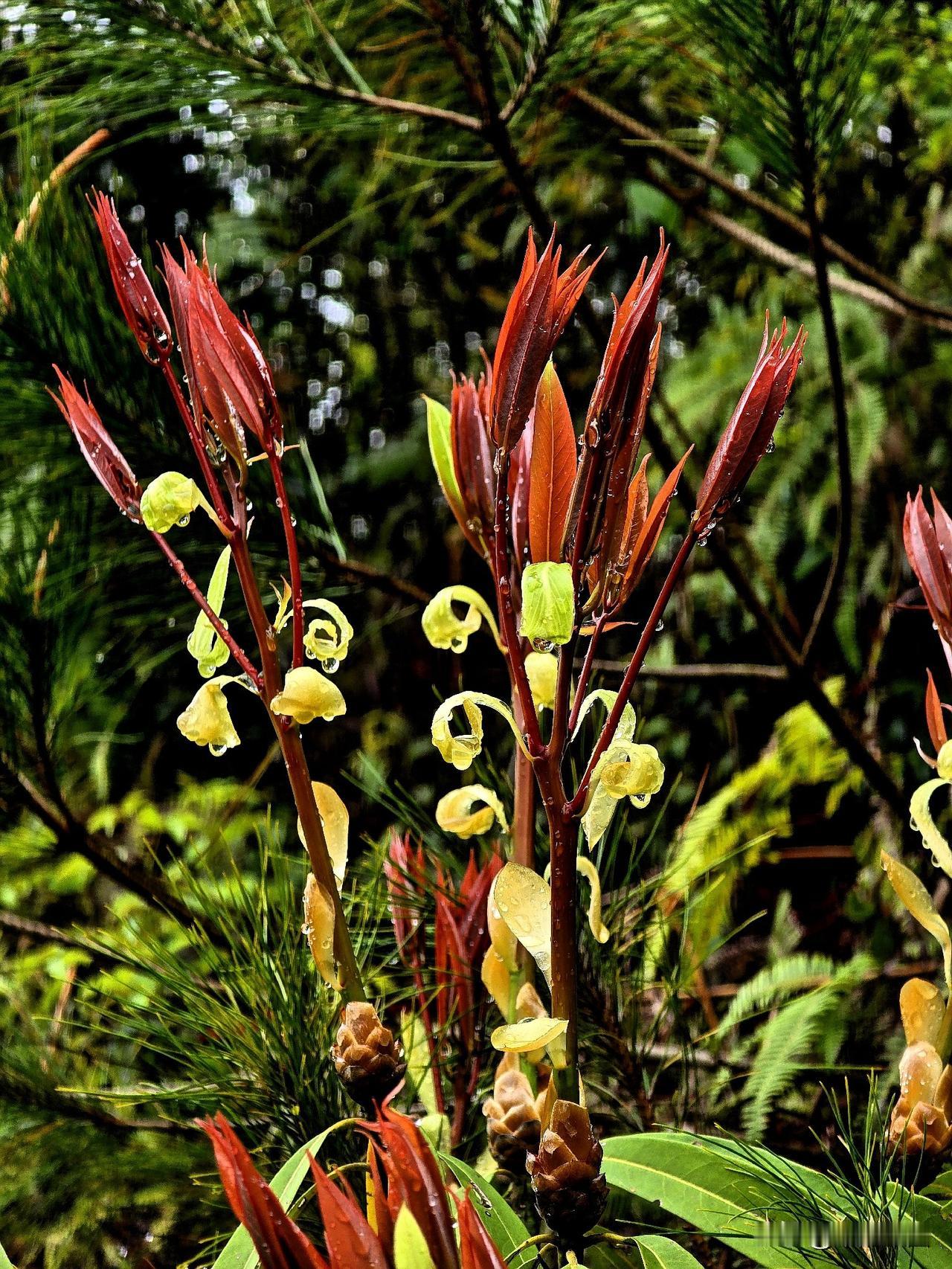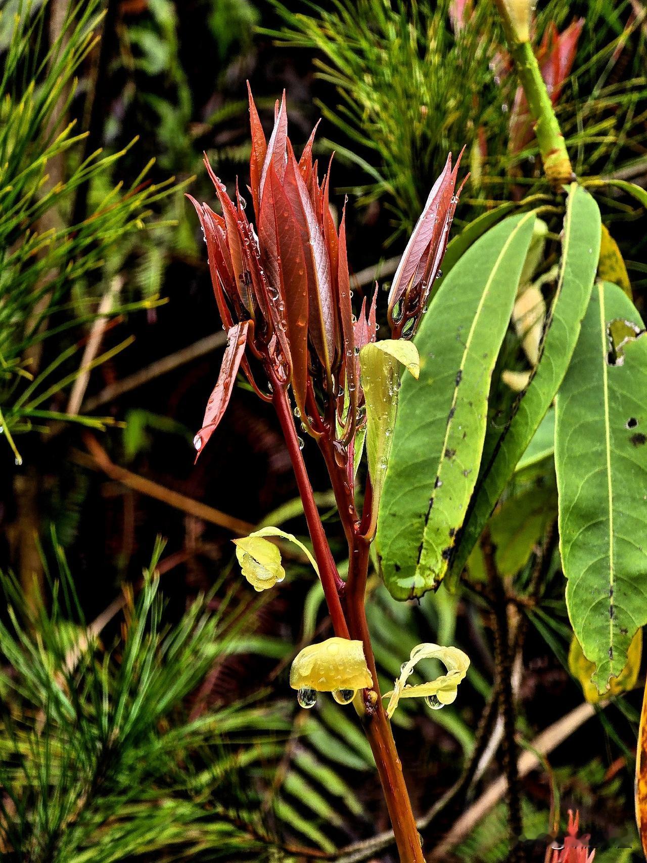春雨新叶 细雨如丝润晓光,绛红新叶缀枝长。 珠凝翠幄轻沾露,苞褪鹅黄欲离霜。 软