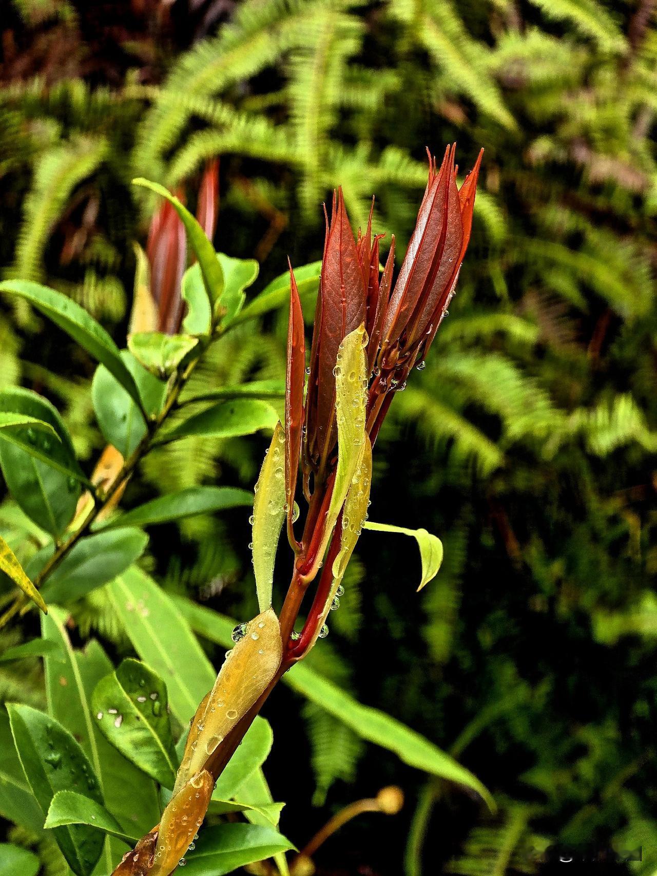 细雨如丝润晓光,绛红新叶缀枝长。