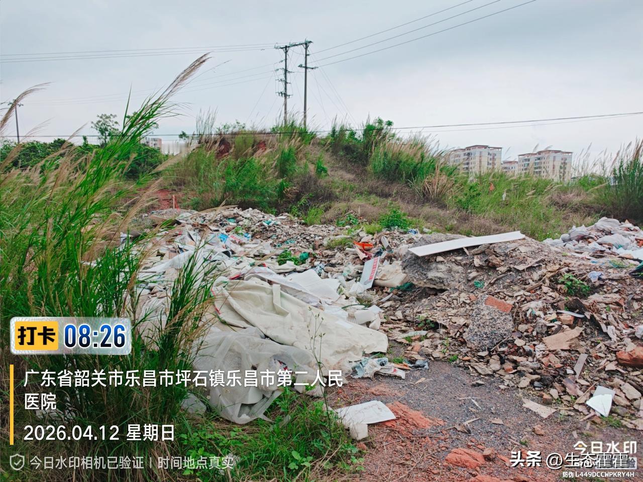 2026年4月12日,志愿者在广东省韶关市乐昌市坪石镇,乐昌市第二人民医院附近走访时,发现一处草丛空地被大量垃圾侵占。
