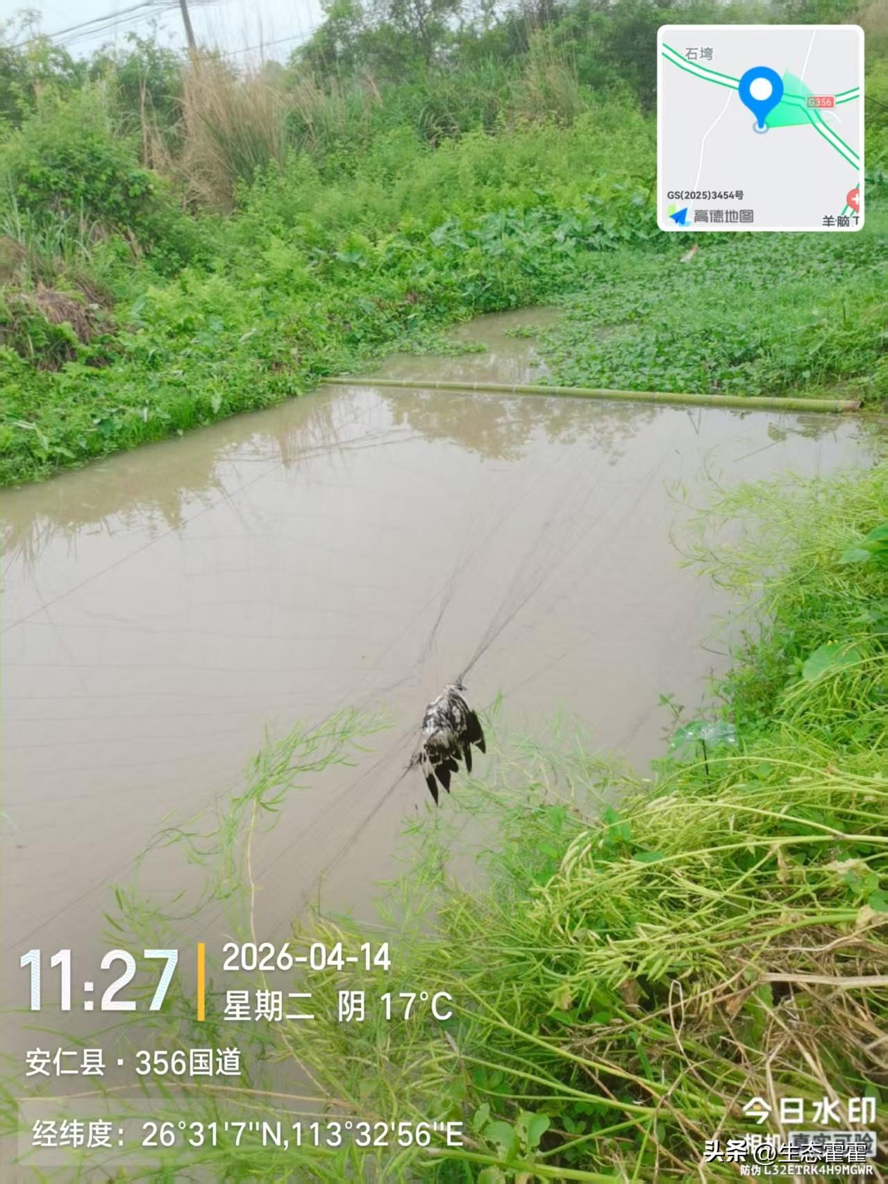 志愿者在湖南省郴州市安仁县金紫仙镇356国道沿线,发现多处非法架设的捕鸟网,网上挂着死去的野生鸟类,场面触目惊心。张网捕鸟属于国家明令禁止的违法犯罪行为,严重破坏生态环境,伤害迁徙候鸟,违反《野生动物保护法》等相关法律法规。