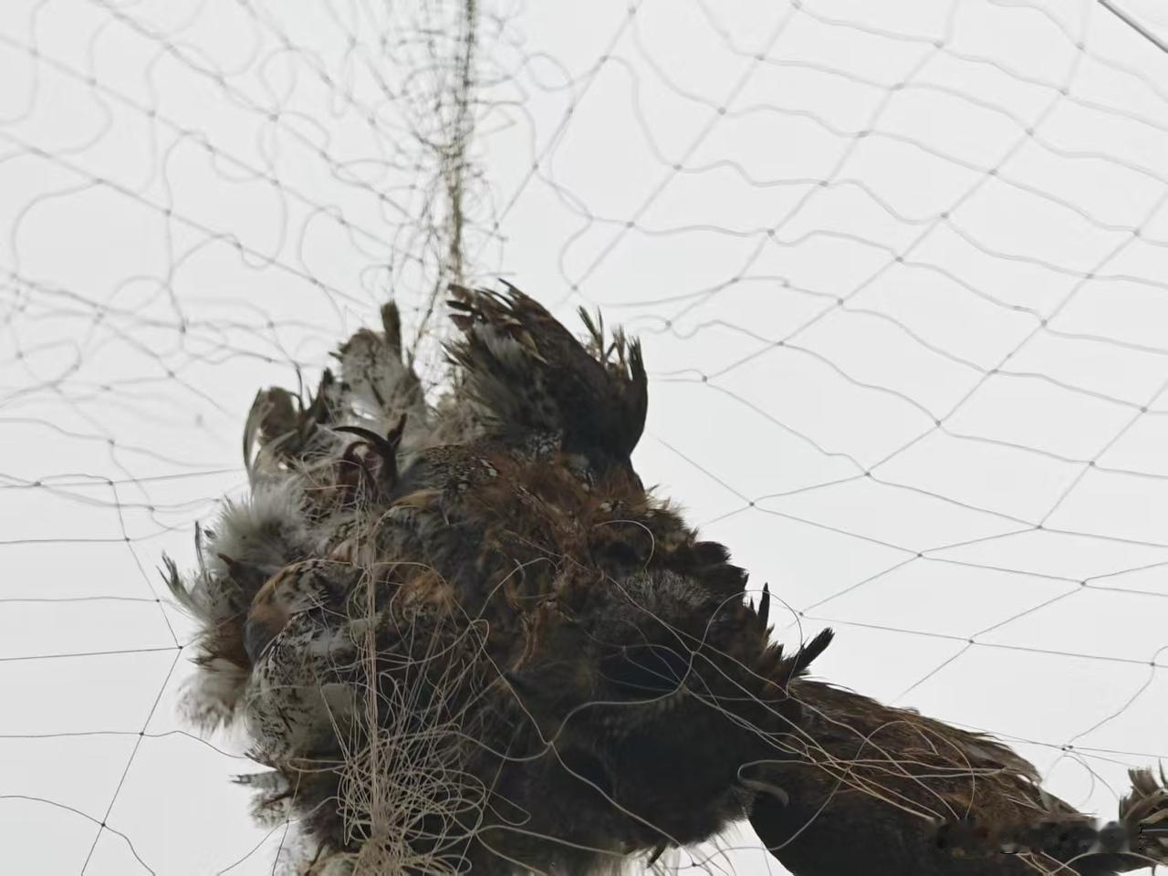 此地已是一而再、再而三顶风作案,网具依旧高悬,此次更发现两只野生鸟类惨死网中,其中一只竟是国家二级保护动物猫头鹰,冰冷僵硬、命丧歹毒罗网!