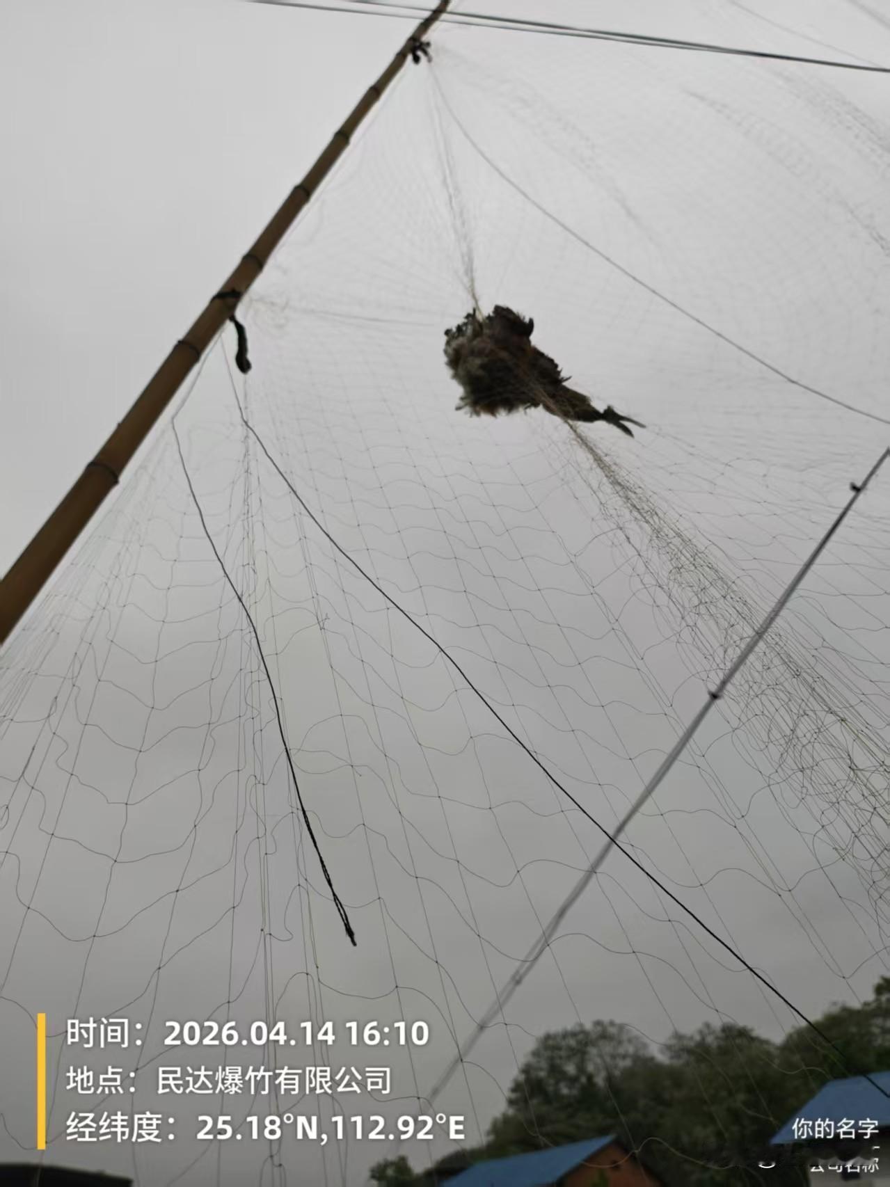 2026年04月14日,中国零鸟网志愿者在湖南省郴州市宜章县岩泉镇东河村,再次发现非法捕鸟网!