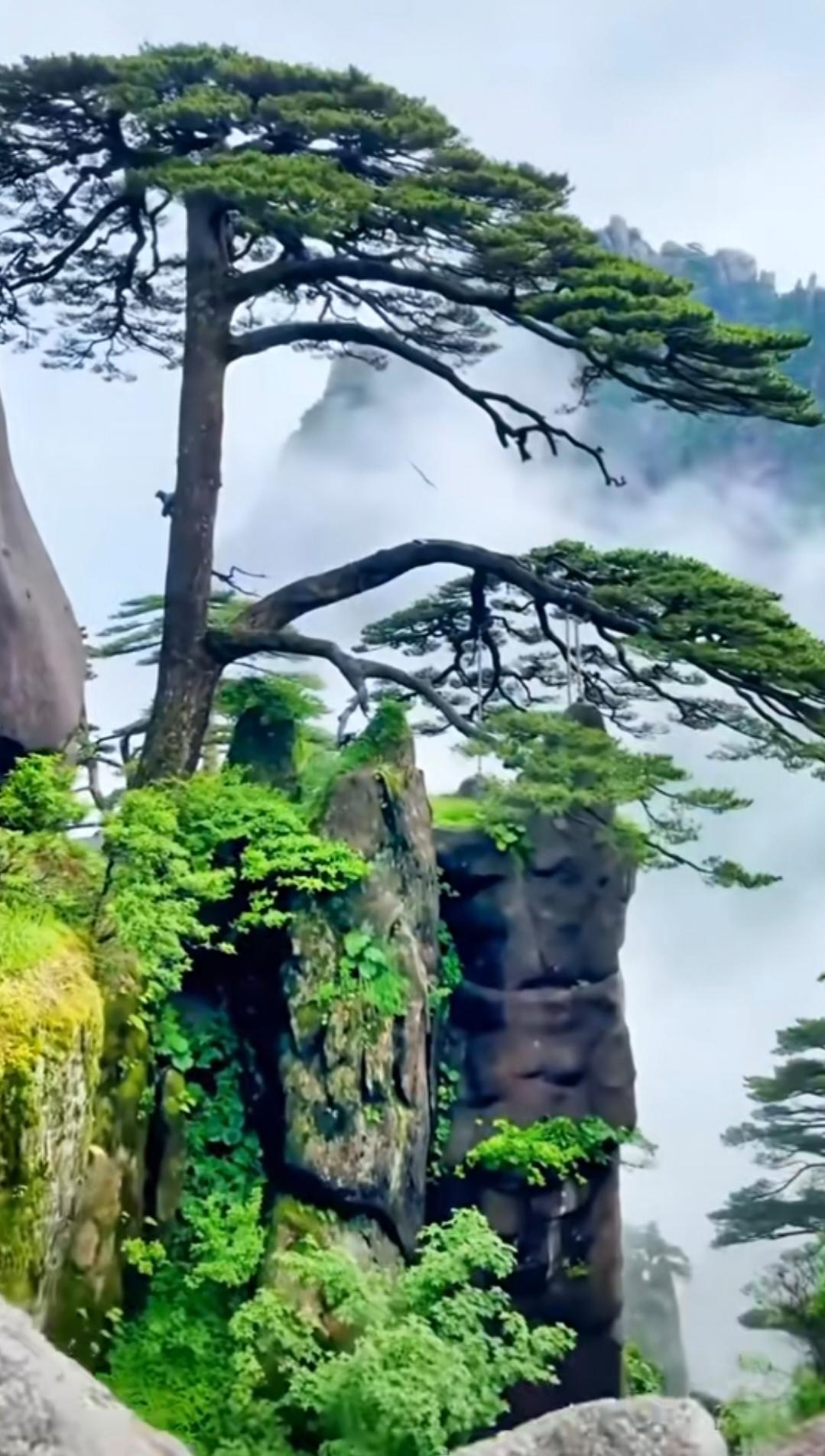 行至山腰,黄山的标志性景致——奇松,便一一映入眼帘。黄山之松,从不似别处林木那般生长在沃土之中,而是扎根于悬崖峭壁的石缝之间,破石而生,傲立挺拔。最是那迎客松,枝干遒劲,一侧枝丫伸出,如人伸出臂膀,盛情迎接八方来客,历经千年风雨,依旧苍翠挺拔,姿态优雅,成为黄山最温情的名片。还有连理松、黑虎松、探海松,每一棵都形态各异,有着独属于自己的风骨,它们或斜倚危崖,或直指苍穹,或俯身探海,以顽强的生命力,在高山之巅书写着坚韧,与险峰相映成趣,成了黄山最动人的底色。