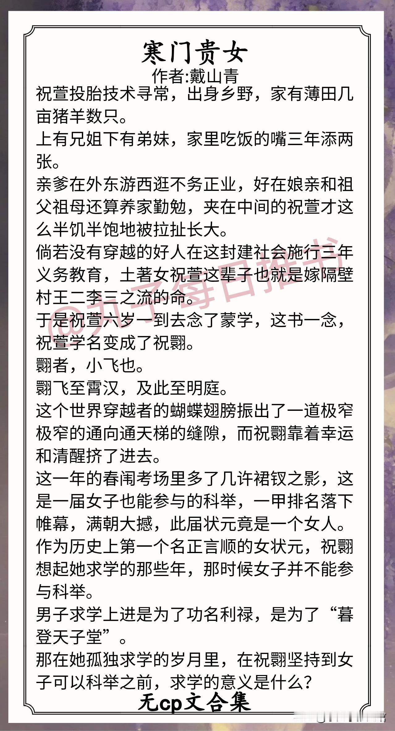 2.《寒门贵女》作者:戴山青(土著女状元,念书科举,朝堂争斗,正剧向)