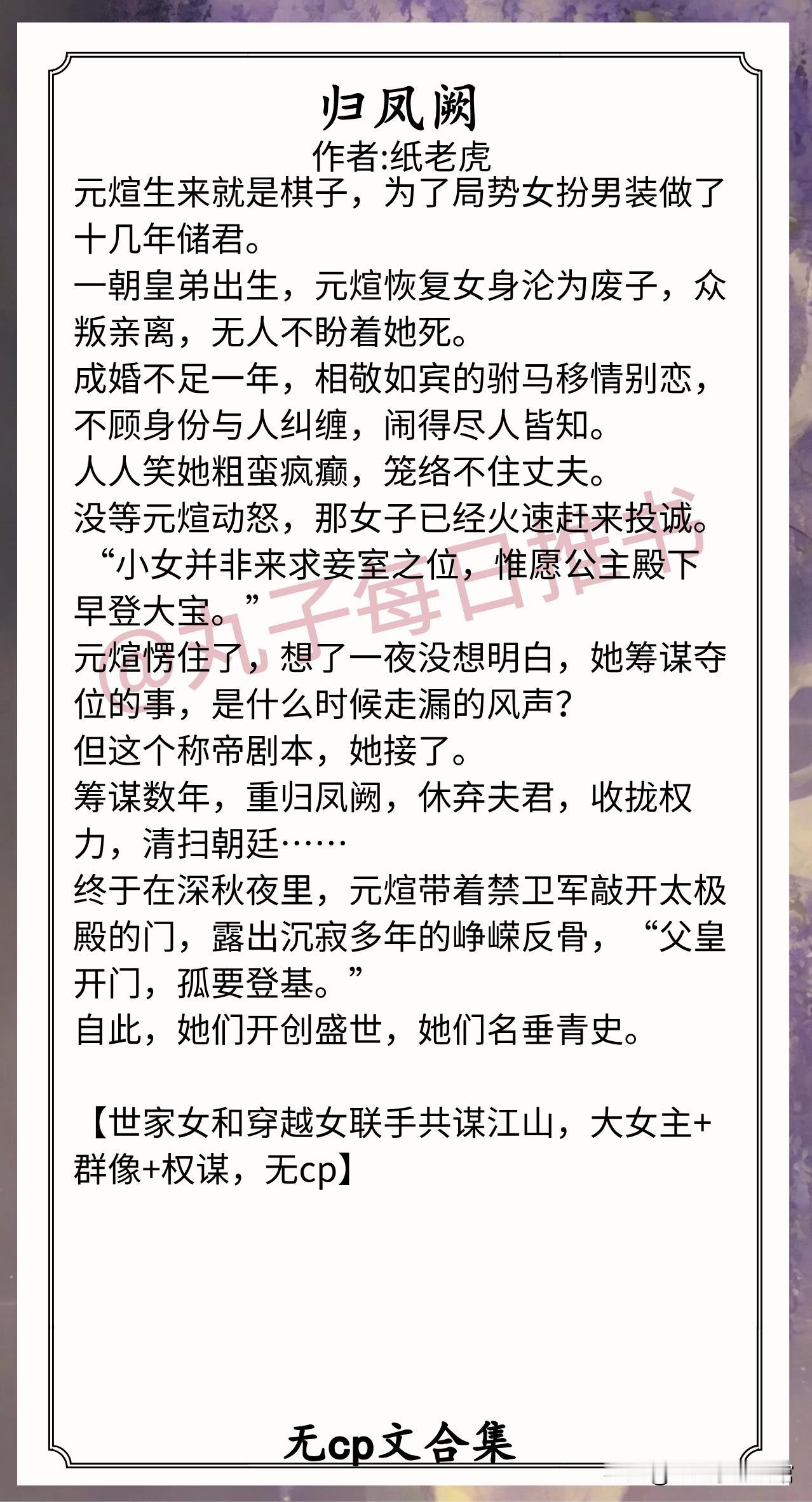 3.《归凤阙》作者:纸老虎(高门女,搞事业,朝堂权谋,大女主,女性群像)